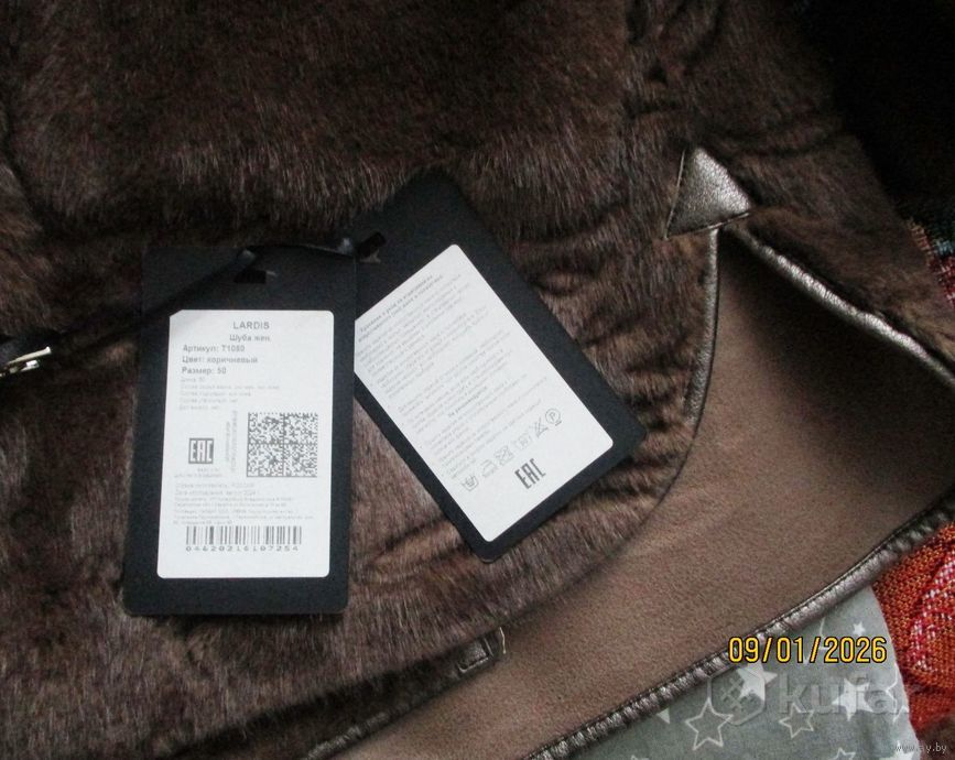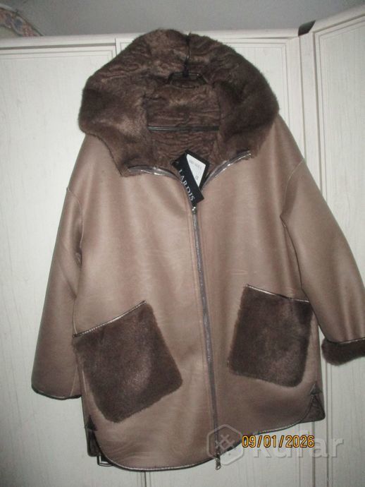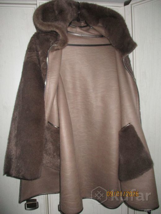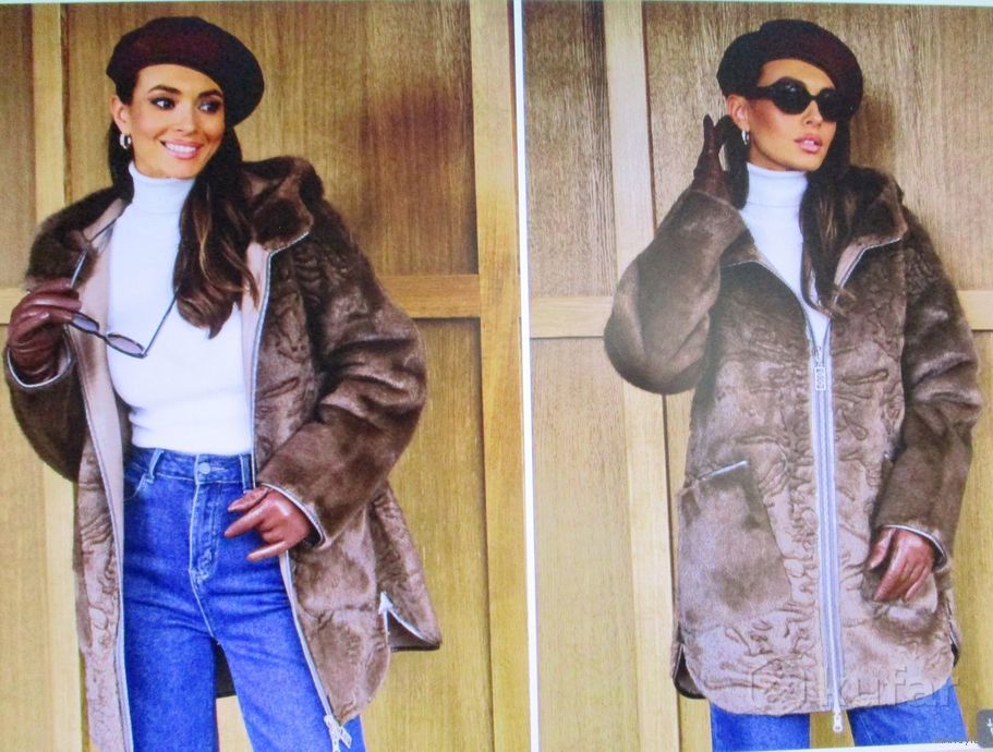 Мех с блеском,очень мягкий Отделка кожей.Хорошая длина,карманы,капюшон. Сидит очень красиво,стройнит.Дорогая.