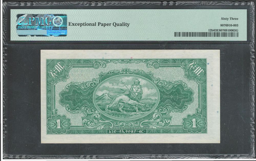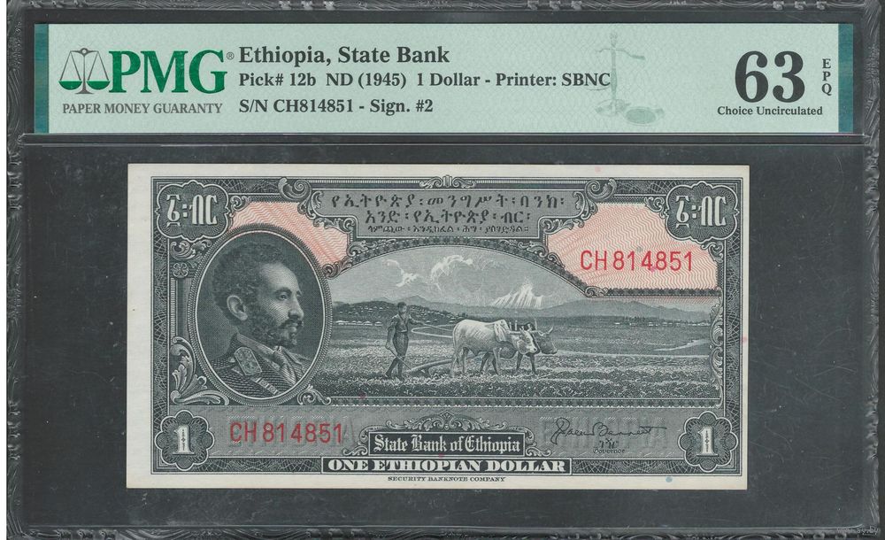 Эфиопия 1 доллар 1945 года. Тип Р-12b. Состояние UNC. В слабе PMG 63