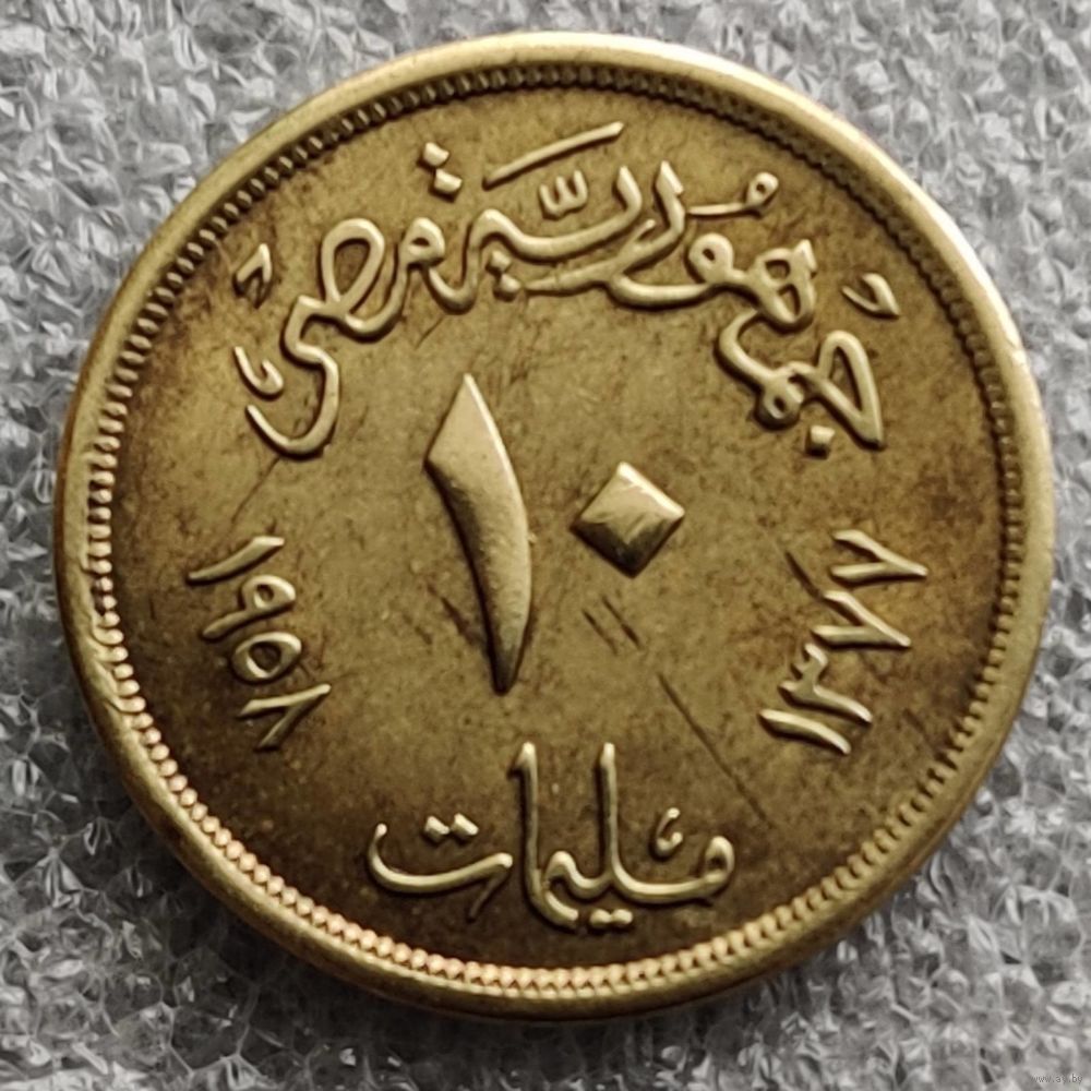 Номер KM # 381 Страна Египет Период Республика Египет (1953 - 1958) Валюта Египетский фунт Вид чекана Регулярный чекан Номинал 10 миллим Год 1955 - 1958 Гурт Гладкий Форма Круг Отношение авс/рев Медальное (0°) Материал Алюминиевая бронза Вес (g) 4,74 Диаметр (mm) 23 Толщина (mm) 1,6