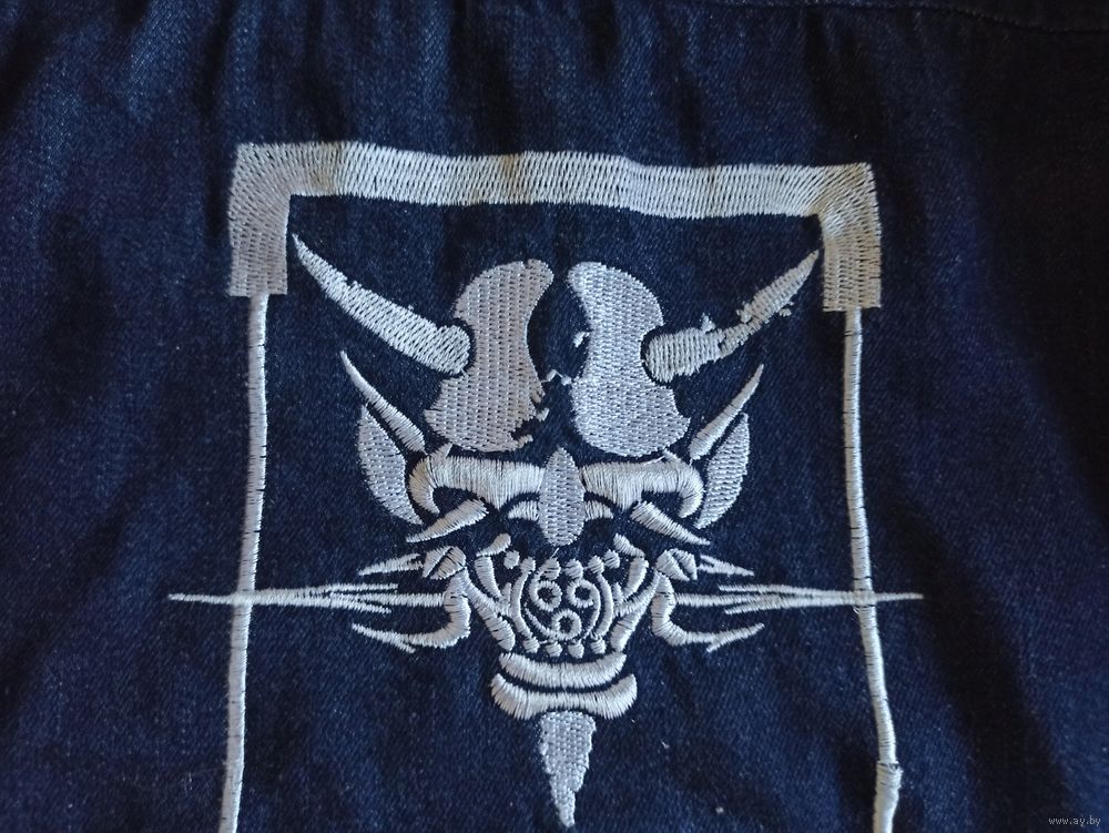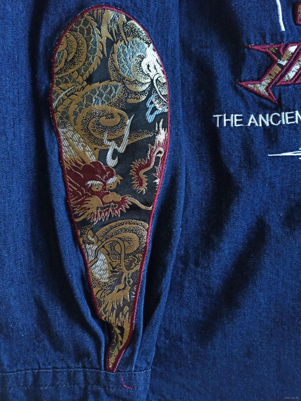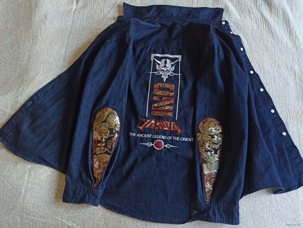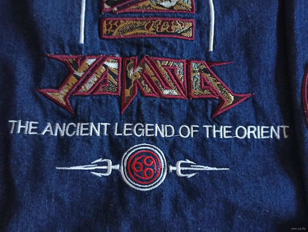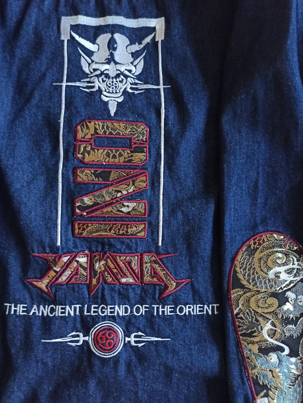Эксклюзивная японская джинсовая -футболка с вышивкой, сочетающая классический джинсовый стиль с яркими элементами японской культуры. Главная особенность модели – детализированные тканевые вставки вдоль рукавов и на спине с изображением драконов и традиционных орнаментов. Куртка имеет аутентичный вид благодаря сочетанию текстур и качественному выполнению деталей. Плотный натуральный деним цвета Indigo (темно-синий). Декор: Жаккардовые вставки с драконами, вышитые патчи, брендированная фурнитура. Очень красивая, эксклюзивная, уникальная, Джинсовка. нашивка японского бренда одежды Oni Denim. джинсового жилета или куртки, украшенного вышивкой и нашивками в азиатском стиле. Выбранная область содержит текст «THE ANCIENT LEGEND OF THE ORIENT» («Древняя легенда Востока») и стилизованное название бренда