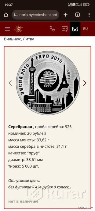 Добрый день, продам коллекционную монету национального банка Республики Беларусь, ЭКСПО (ЭКСПА, EXPA)