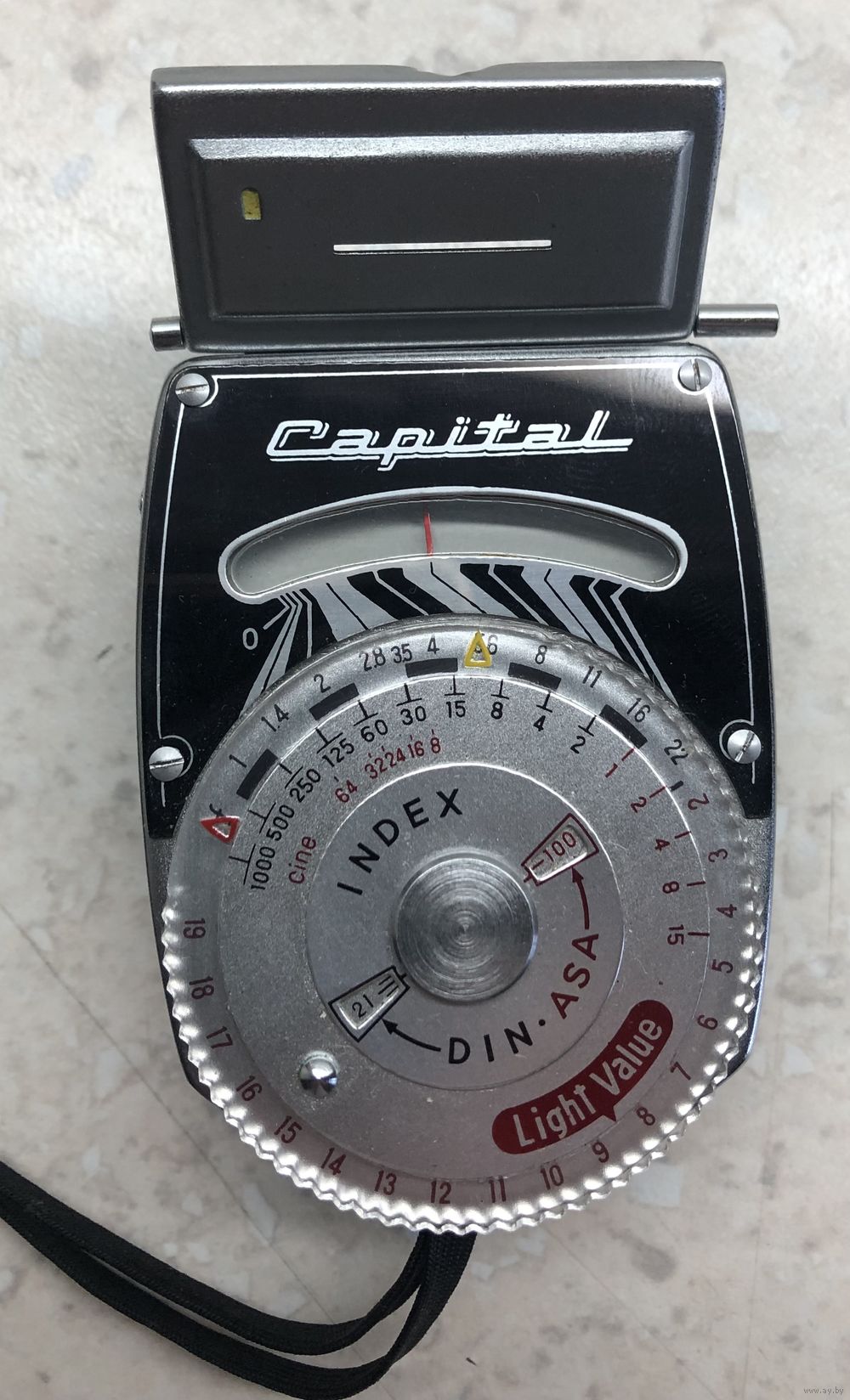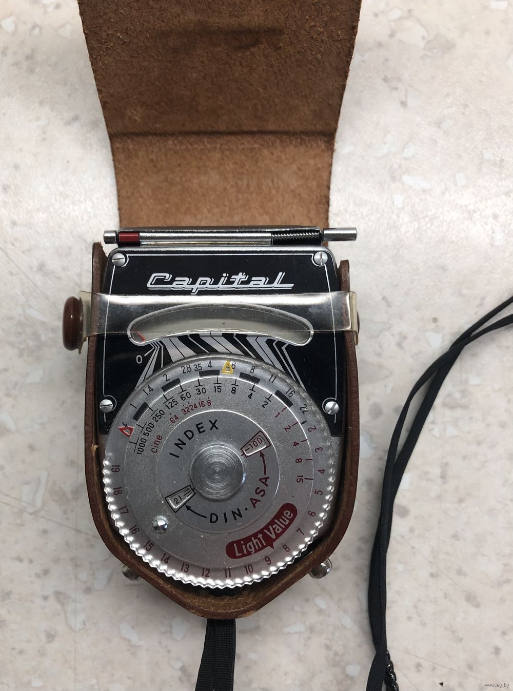 селеновый, Kinox, Япония, 1960-70-ые гг., полностью рабочий, показания точны, родной кожаный футляр с нашейным шнурком, преимущества: отсутствие потребности в элементах питания, недостатки: садящийся селен, конструктивные преимущества: единственный недостаток компенсируется конструктивной особенностью: селеновый элемент постоянно находится почти в темноте - в режиме "молочного стекла", - закрытый металлической заслонкой с узкой щелью, как в эскимосских "солнечных очках"
