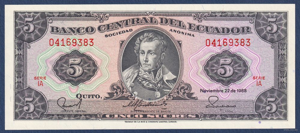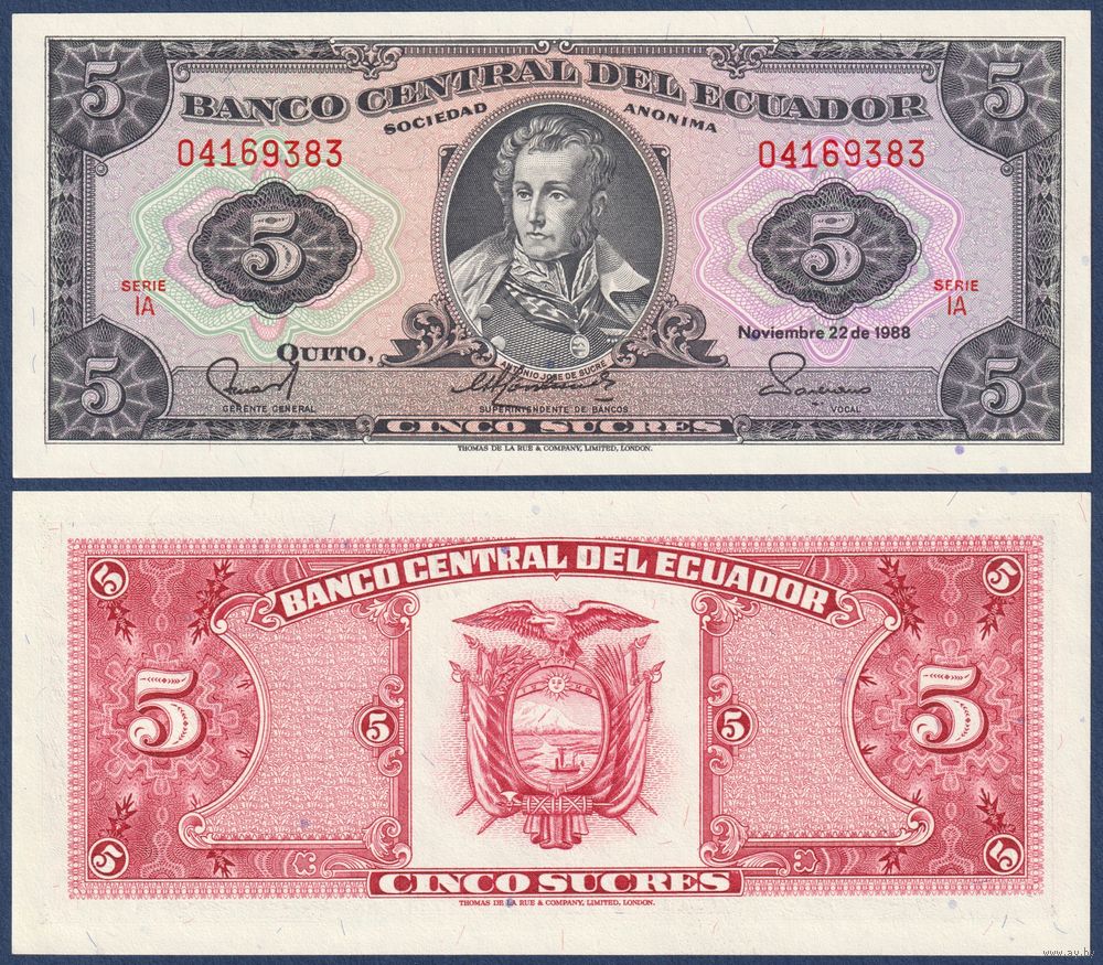 Эквадор, 5 сукре 1988 г., P-113d(1) (IA, правитель Антонио Хосе Сукре), UNC