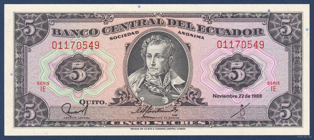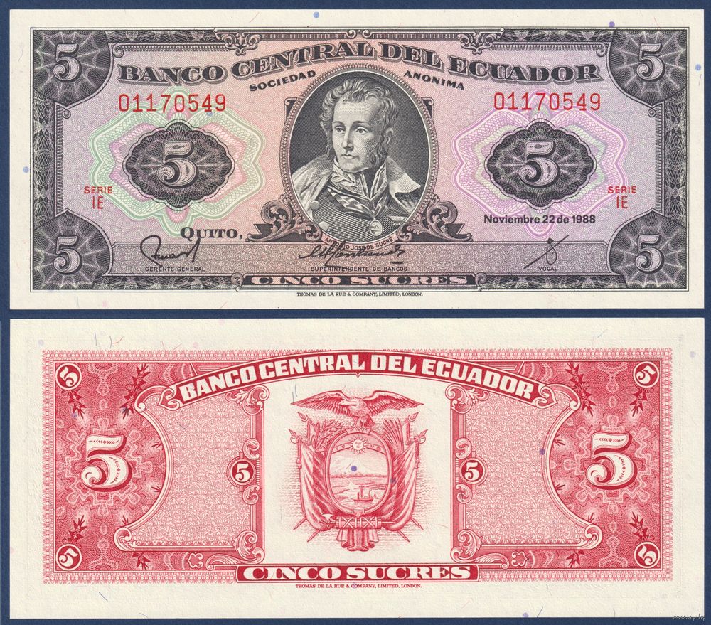 Эквадор, 5 сукре 1988 г., P-113d(5) (IE, правитель Антонио Хосе Сукре), UNC
