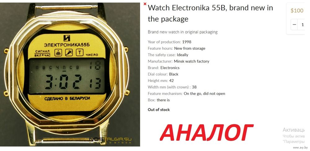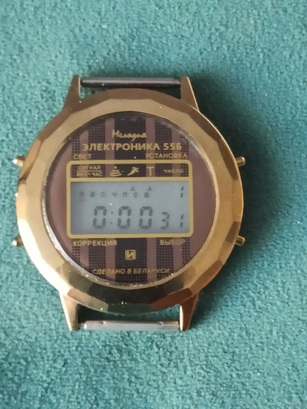 "Электpoникa 55 Б . Мелодия " с циферблатом золотого цвета. Это коллекционный предмет, произведенный на заводе «Электроника» в Минске в середине 2000-х годов, редкая модификация советских цифровых наручных часов серии «Электроника 55» . Аналоги в интернете оцениваются в 100 уе. Основные характеристики и особенности: