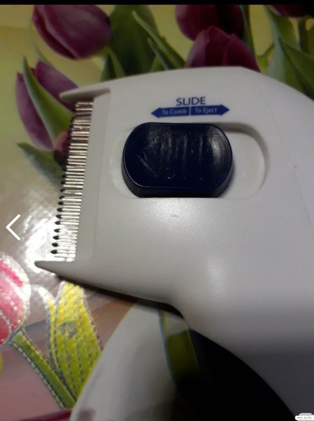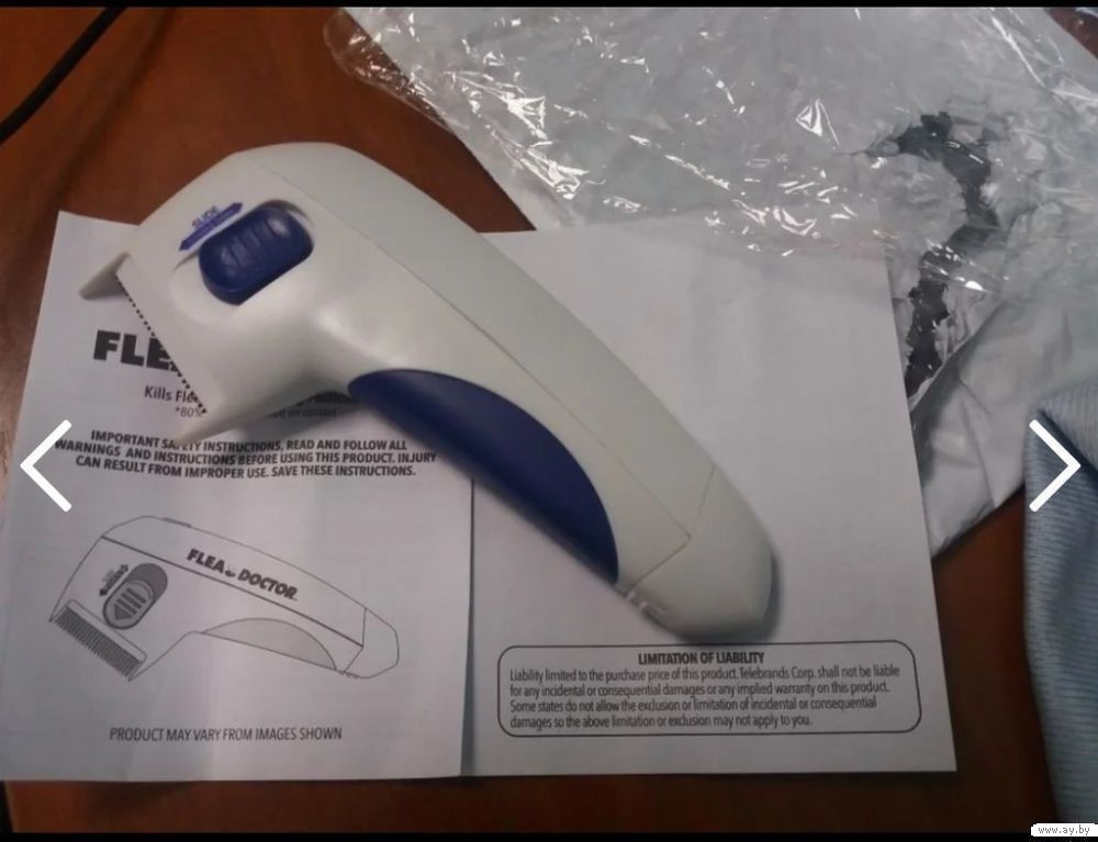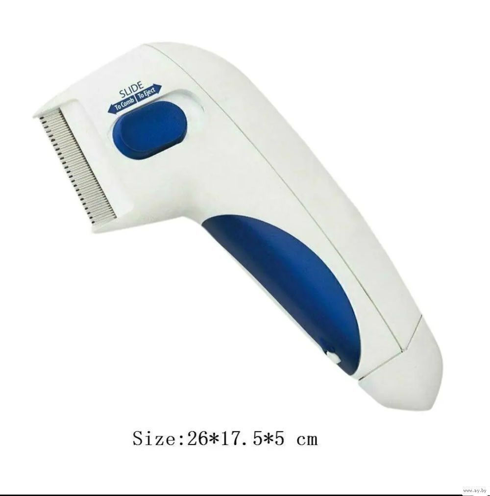 Принцип работы: очень частая расческа вычесывает шерсть, блоха попадается на зубчики и разряд тока её убивает,