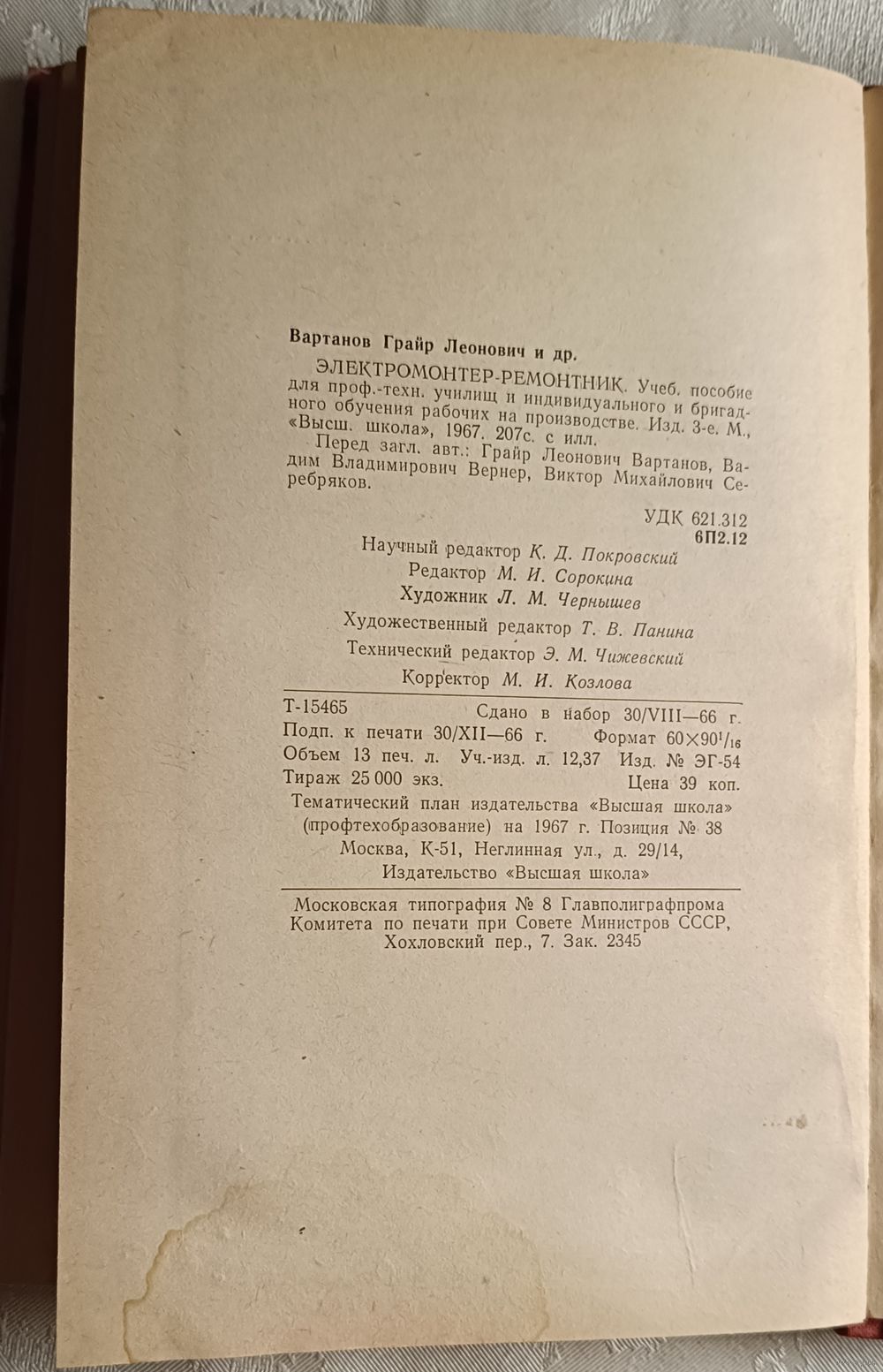 Вартанов Грайр Леонович. Электромантер-ремонтник. Учеб. пособие для ПТУ и индивидуального и бригадного обучения рабочих на производстве. Изд. 3-е. М., «Высш. школа», 1967. 207с. с илл., твёрдый переплёт, чуть увеличенный формат.