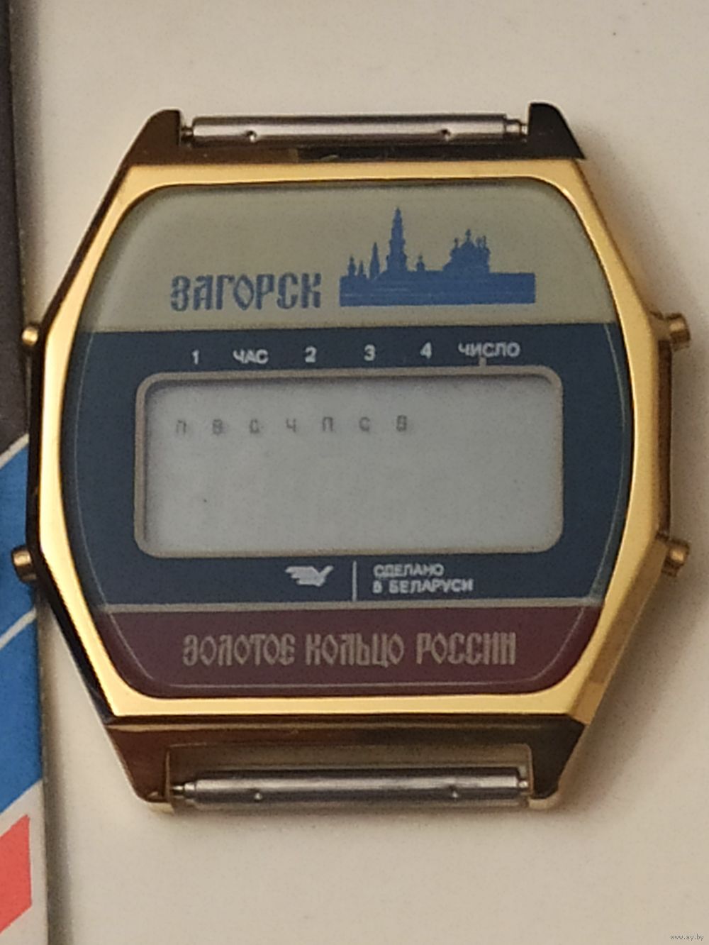 Электроника 5 . Часы из серии "Золотое кольцо России", посвященные г.Загорску (ныне г.Сергиев Посад). 1988 г. Новые, функции работы: настройка времени и даты, будильник, звуковые сигналы, подсветка.