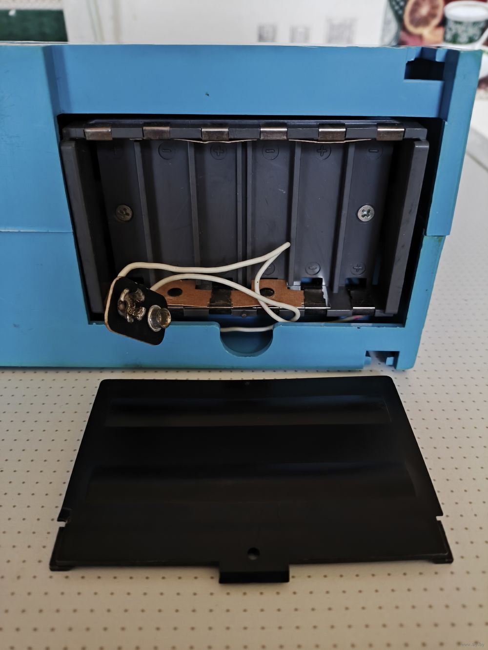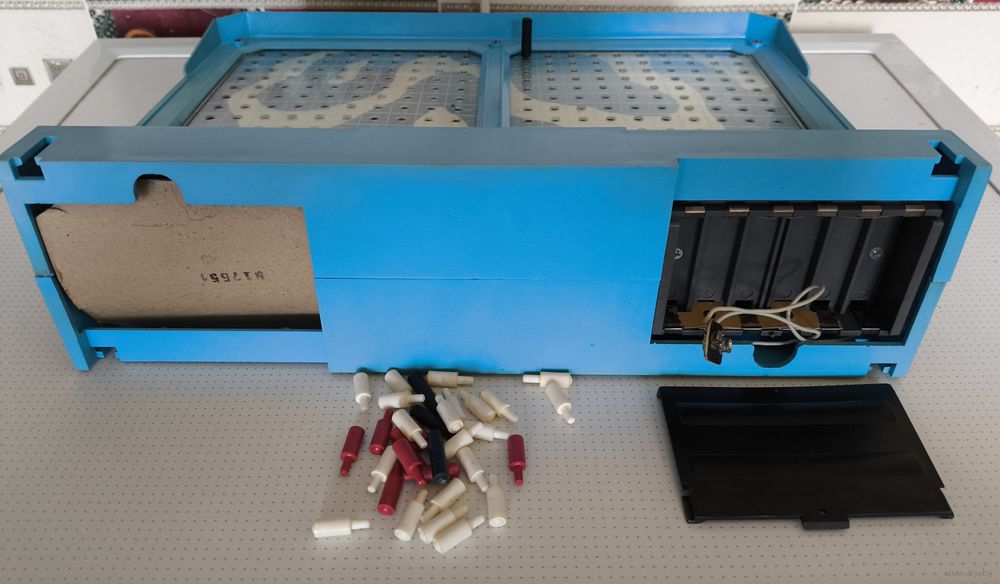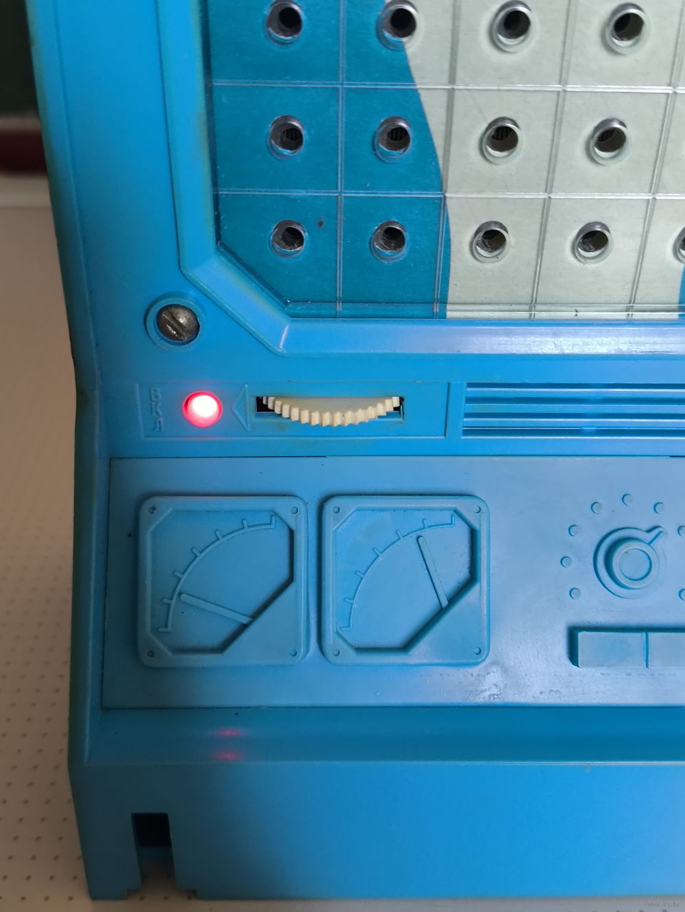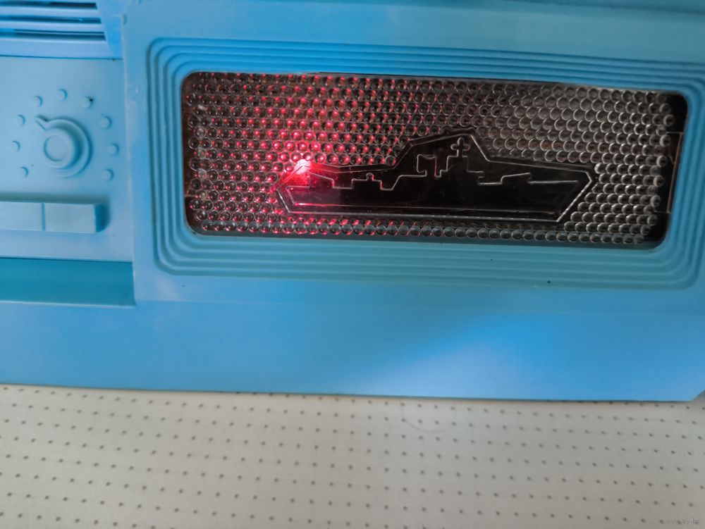 Внешний состояние на фото.Включается работает лампочка горит,если пробовать подбить корабль сробатывает звук подбития но не всегда, может через раз или вообще не сработать.Все клетки не проверял на подбитие короблей только некоторые.Как корректно игра работает сказать не могу.Включал от батарейки крона.У трёх черных фищек сломоны кончики на фото видно.
