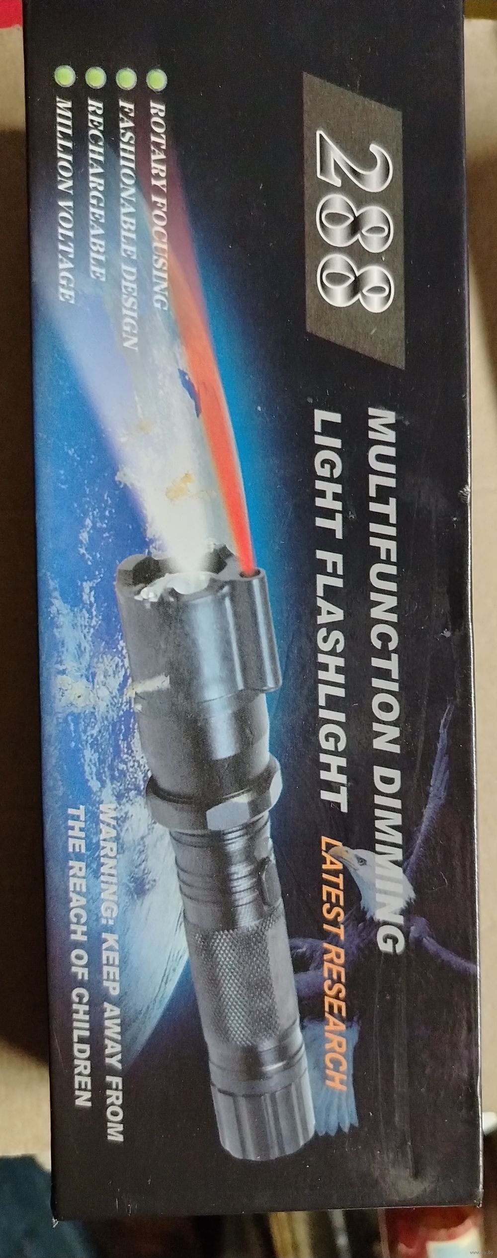 Электрошокер-фонарь с лазерной указкой . Заряжается от сети 220V. Прекрасно отпугивает собак треском или лазерным лучом. Фонарь бьёт далеко очень яркой световой точкой.