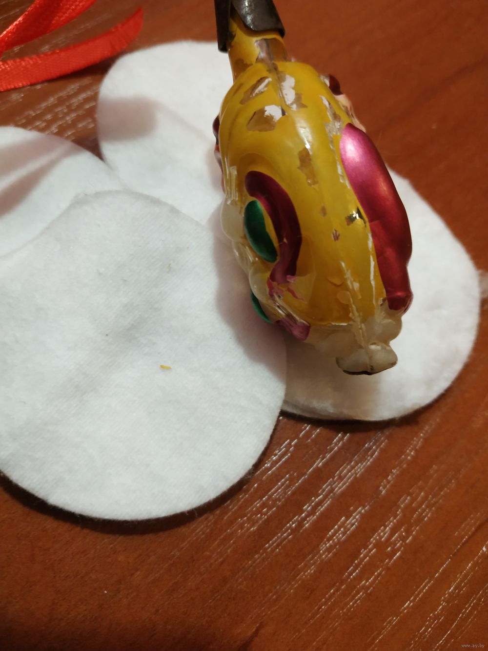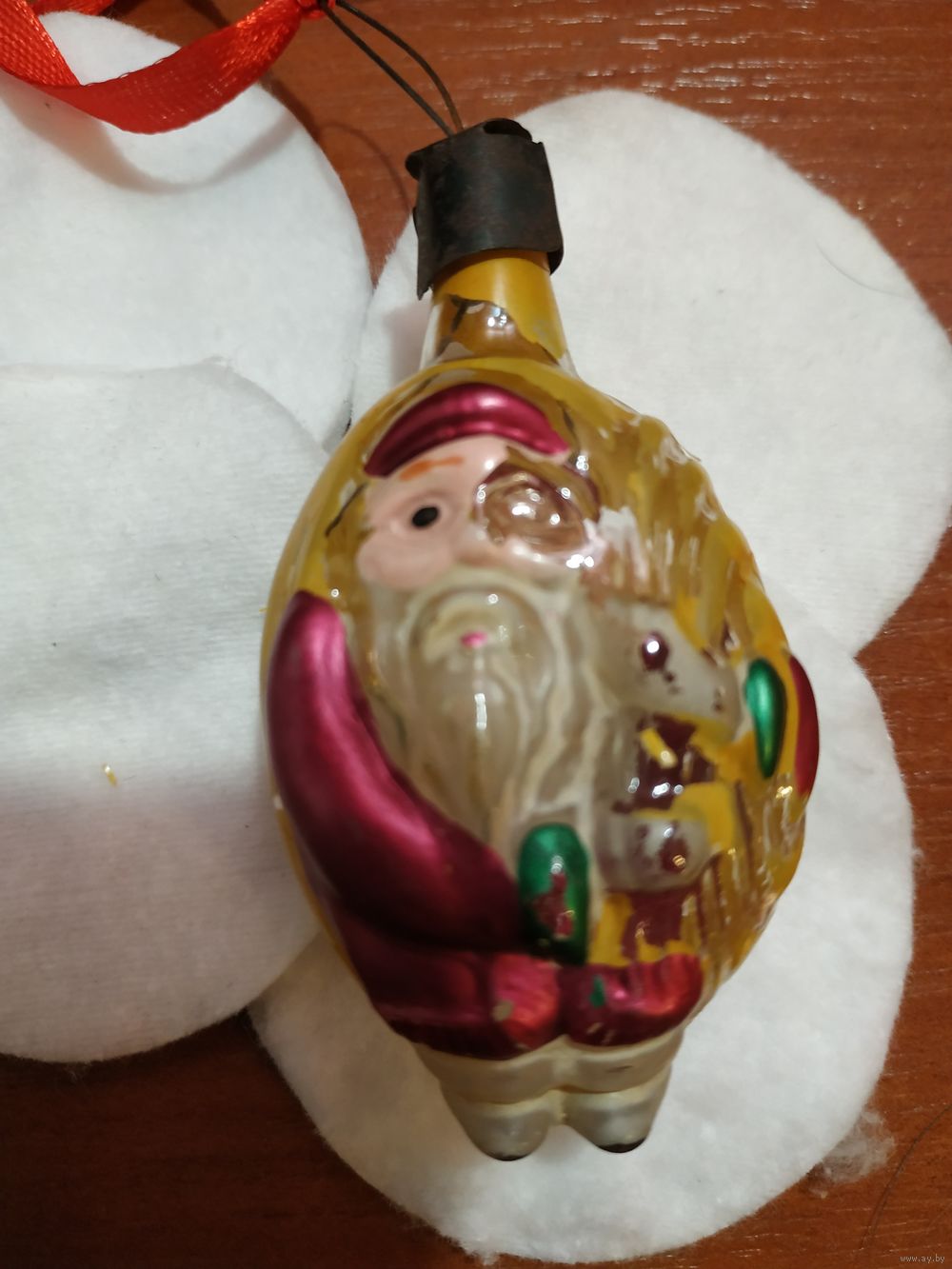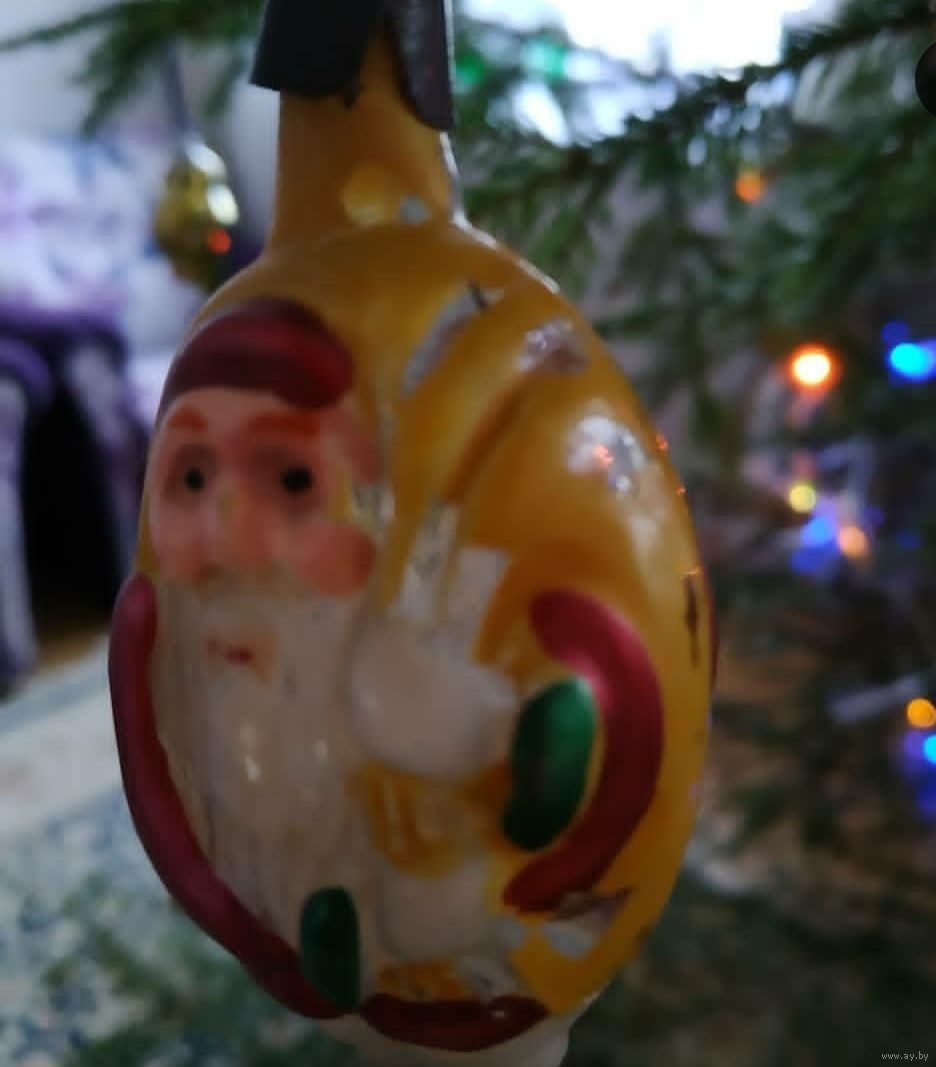 | очень редкая елочная игрушка. Местами стерта краска. Рисунок с двух сторон игрушки одинаковый (Дед Мороз). Состояние на фото. | |