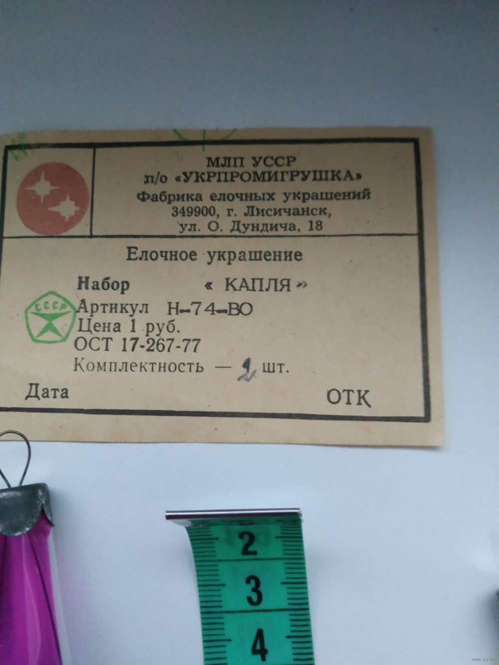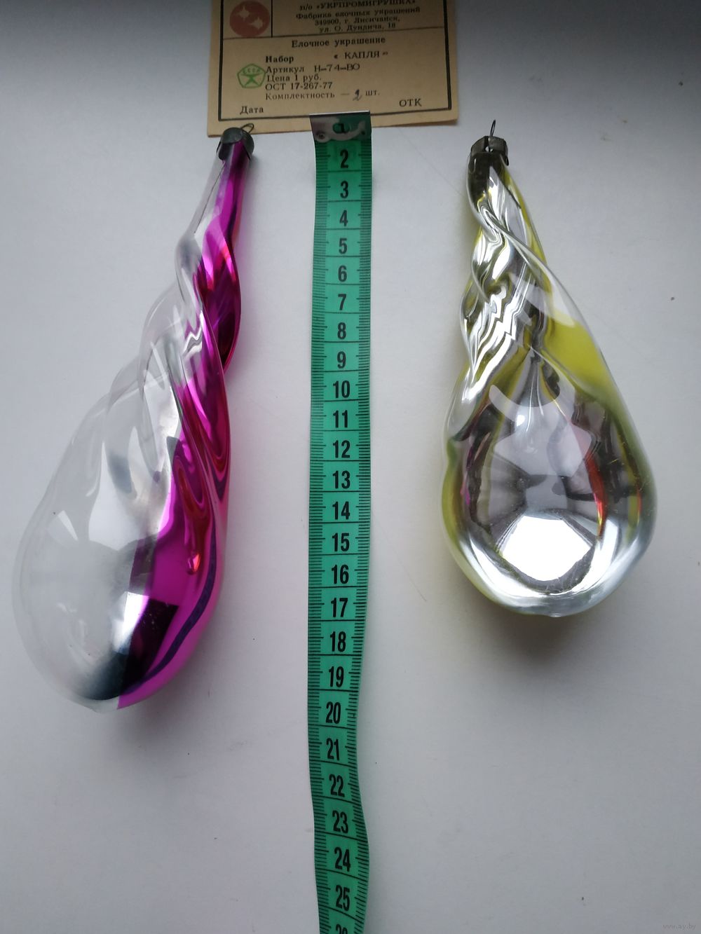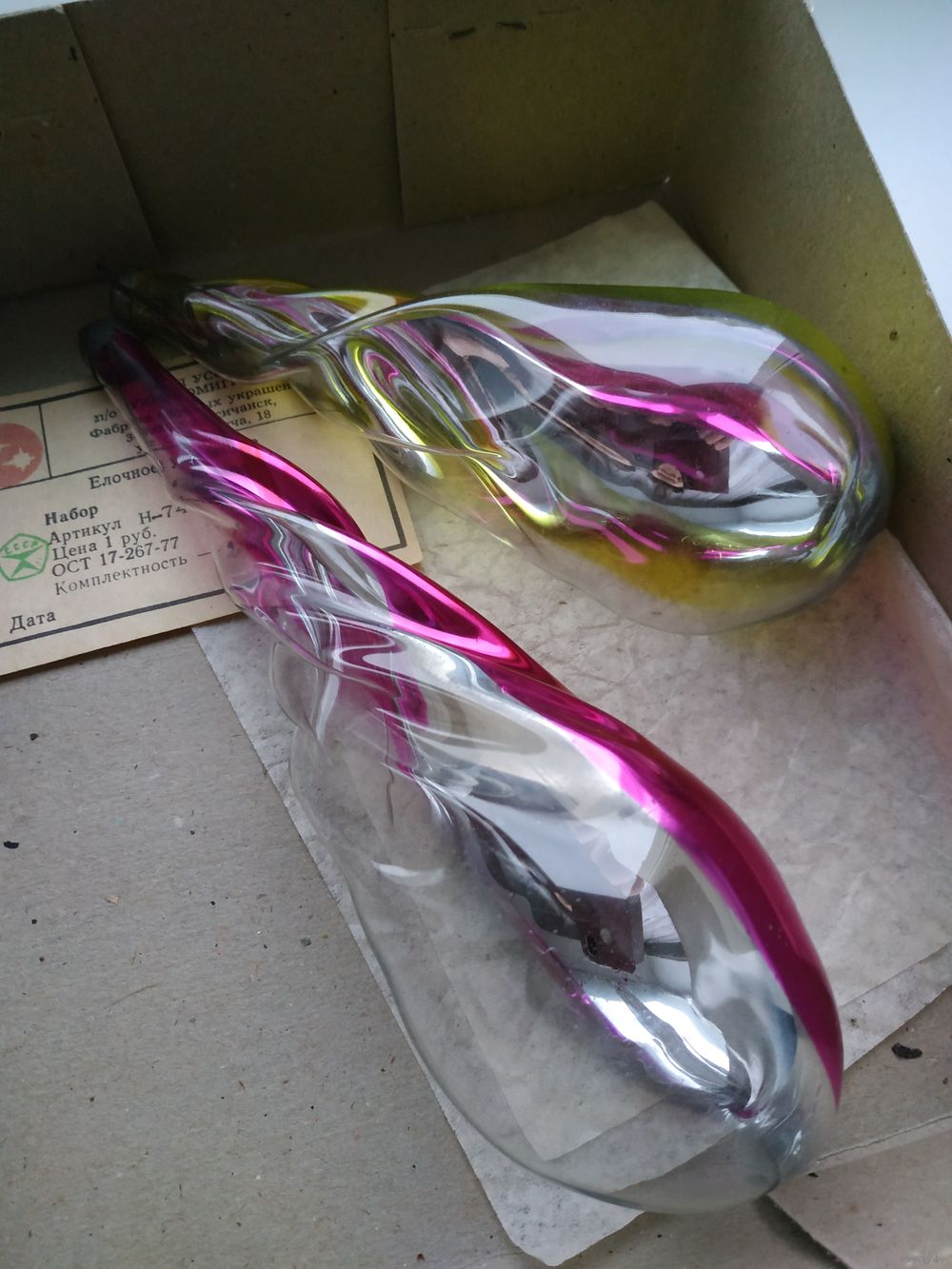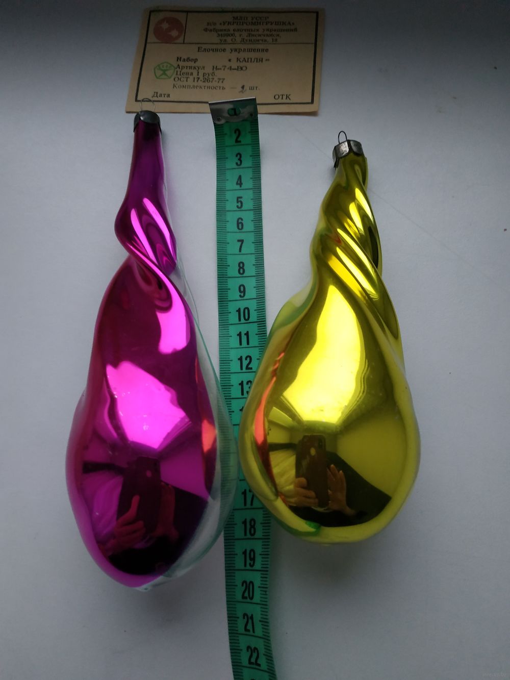 | Набор елочных украшений "Капля" в родной упаковке. 70-е. Большие 19 см. Незначительное повреждение горловины Невероятно красиво смотрятся на елке при подсветке(на фото) | |