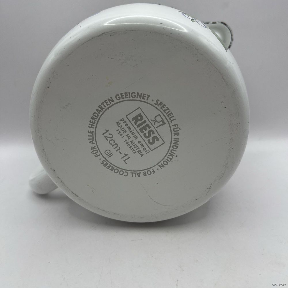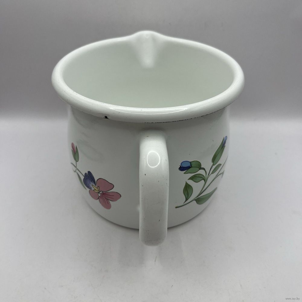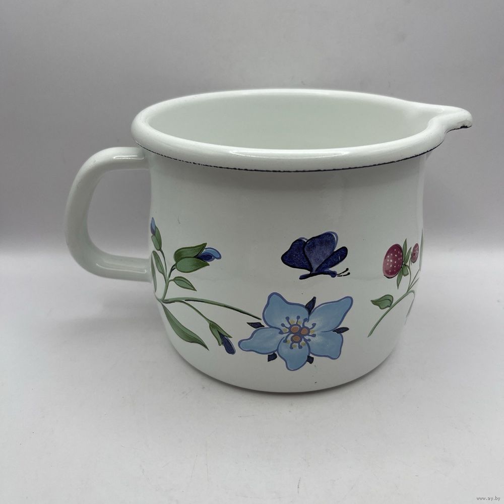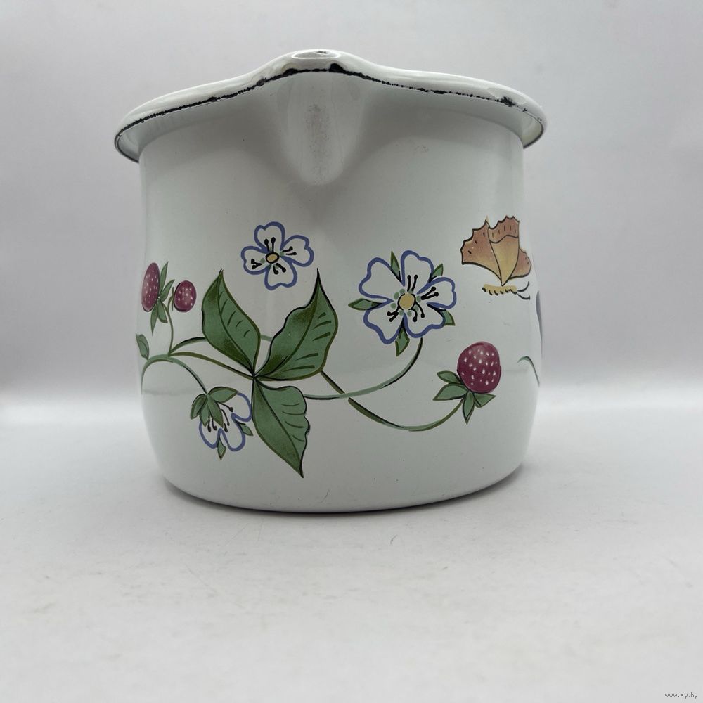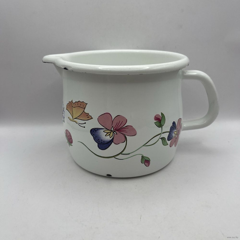 Винтажный эмалированный ковш с широким горлом, кастрюлька с ручкой и носиком-желобком. С ярким летним рисунком, выполненным вручную . Австрия. 1990-е г.г. Клеймо. Подходит для всех видов плит. Объем 1,0 л. Диаметр 12 см, высота 11,5 см, ширина ручка-носик 19 см. Сколы на эмали, следы бытования (см. фото). Идеально подойдет в качестве цветочного кашпо или для декора кухни.