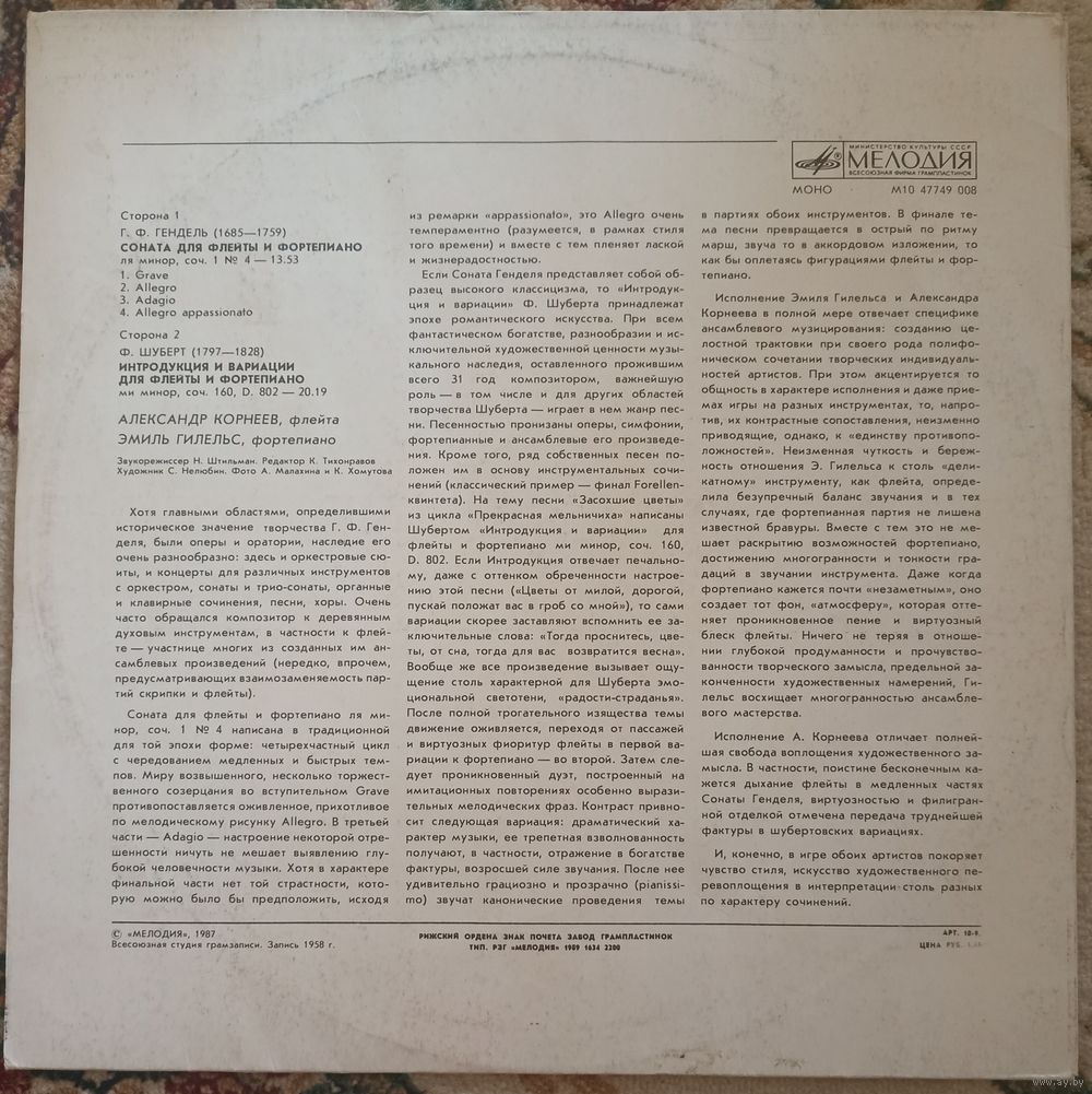 Emil Gilels, Alexander Korneyev - G. Handel / F. Schubert – Соната Для Флейты И Фортепиано / Интродукция И Вариации Для Флейты И Фортепиано