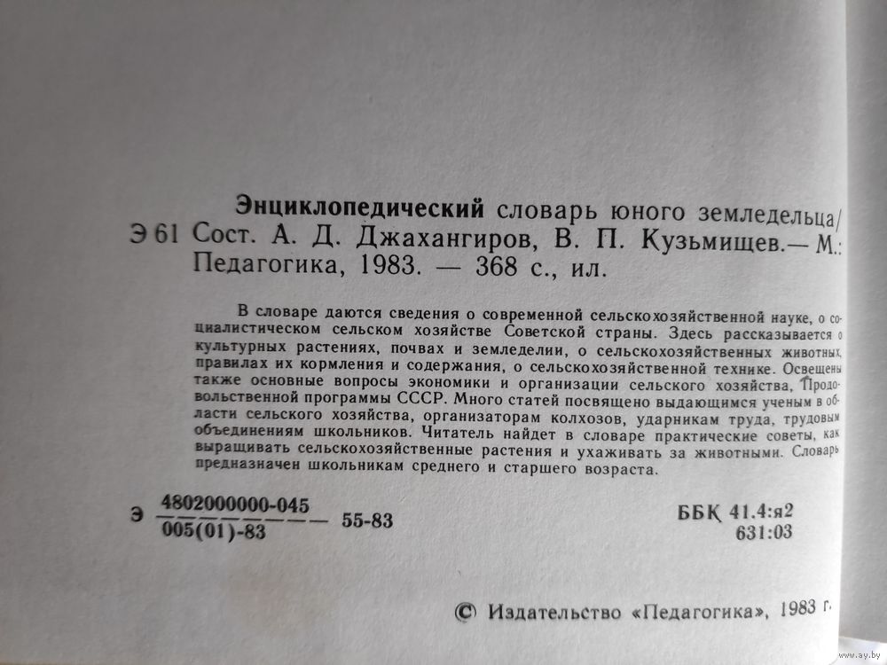 В словаре даются сведения о современной сельскохозяйственной науке, о социалистическом сельском хозяйстве Советской страны. Здесь рассказывается культурных растениях, почвах и земледелии, о сельскохозяйственных животных, правилах их кормления и содержания, о сельскохозяйственной технике. Освещены также основные вопросы экономики и организации сельского хозяйства, Продовольственной программы СССР. Много статей посвящено выдающимся ученым в области сельского хозяйства, организаторам колхозов, ударникам труда, трудовым объединениям школьников. Читатель найдет в словаре практические советы, как выращивать сельскохозяйственные растения и ухаживать за животными. Словарь предназначен школьникам среднего и старшего возраста.