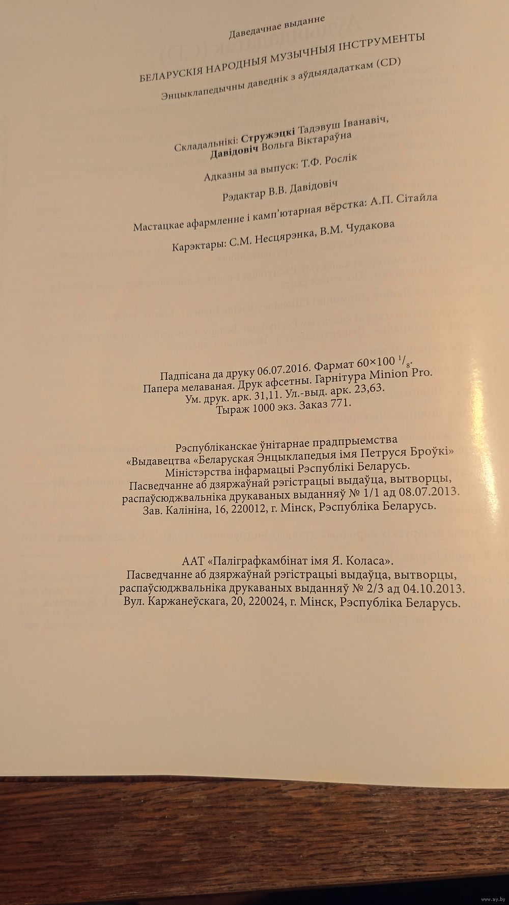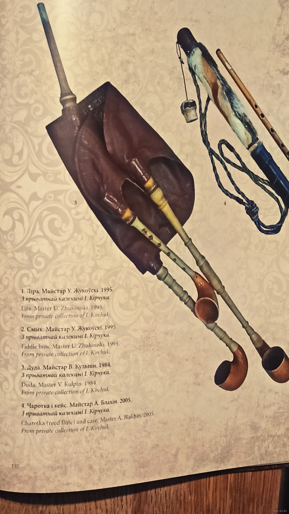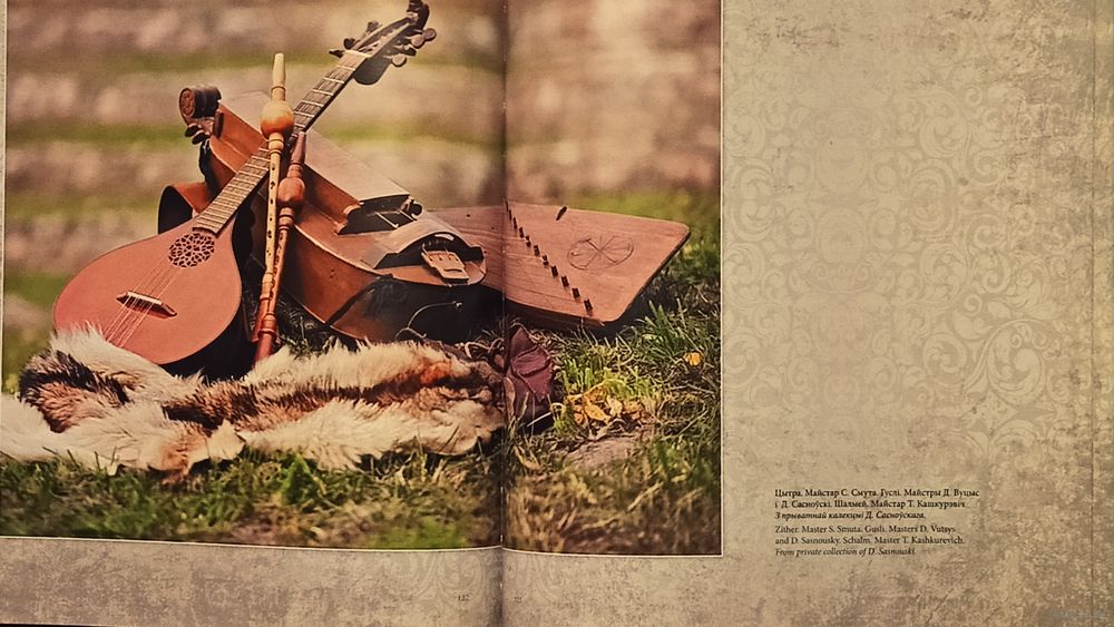"Книга на двух языках — белорусском и английском — посвящена музыкальной культуре белорусского народа. Идея иллюстрированного издания — рассказать историю изготовления и игры различных народных инструментах (дуда, гармонь, жалейка, волынка, гармошка, цимбалы и т. д.). Более 180 редких частных и около 200 музейных фотографий дополняют биографии белорусских мастеров и музыкантов. В книге впервые дается описание и характеристика музейных собраний. Работа сопровождается не только фотографиями, но и CD-диском с музыкальными композициями белорусских исполнителей