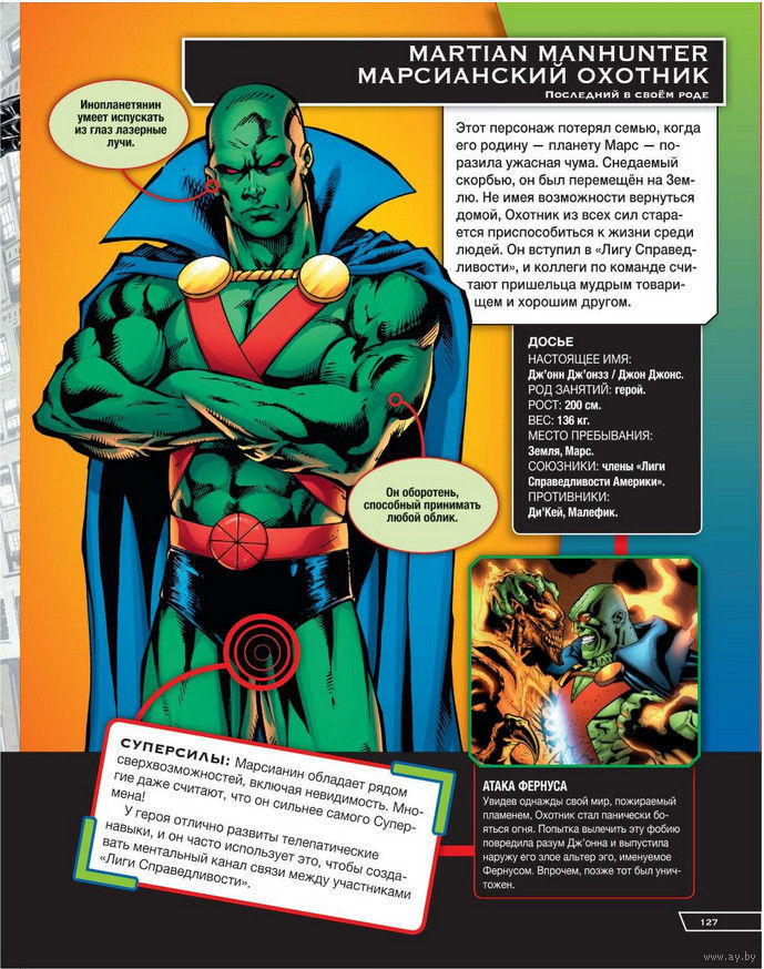 Потрясающий подарок как для любителей комиксов, так и для тех, кто впервые открывает для себя этот увлекательный жанр! Вся легендарная вселенная DC под одной обложкой! Впервые издающийся в России мировой бестселлер предоставит читателям возможность узнать самое интересное о более чем двух сотнях культовых супергероев и суперзлодеев - о Бэтмене, Джокере, Супермене, Женщине-Кошке, Зелёном Фонаре и других известных персонажах этой фантастической реальности, существующей и всеми любимой вот уже три четверти века. Статьи и иллюстрации энциклопедии созданы знаменитыми экспертами, а также самыми популярными художниками индустрии комиксов. Каждое досье включает в себя настоящее имя и прозвище героя, описание его или её сверхспособностей, пересказ одного из ключевых моментов приключений персонажа, информацию о роде занятий и месте пребывания, а также о главных союзниках и врагах.