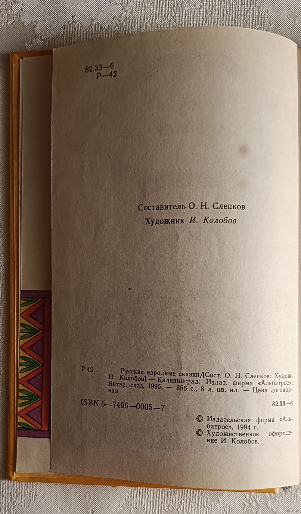 Энциклопедия сказок. Русские народные сказки. Сост. О. Н. Слепков; Худож. И. Колобов. Калининград: Издат. фирма «Альбатрос»: Янтар, сказ, 1995, - 356 с., 8 л. цв. ил., твердый переплет, обычный формат.