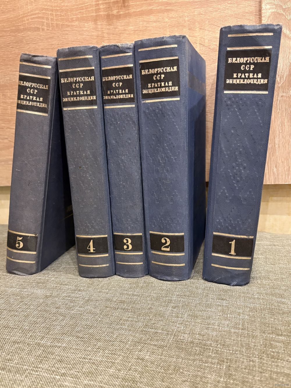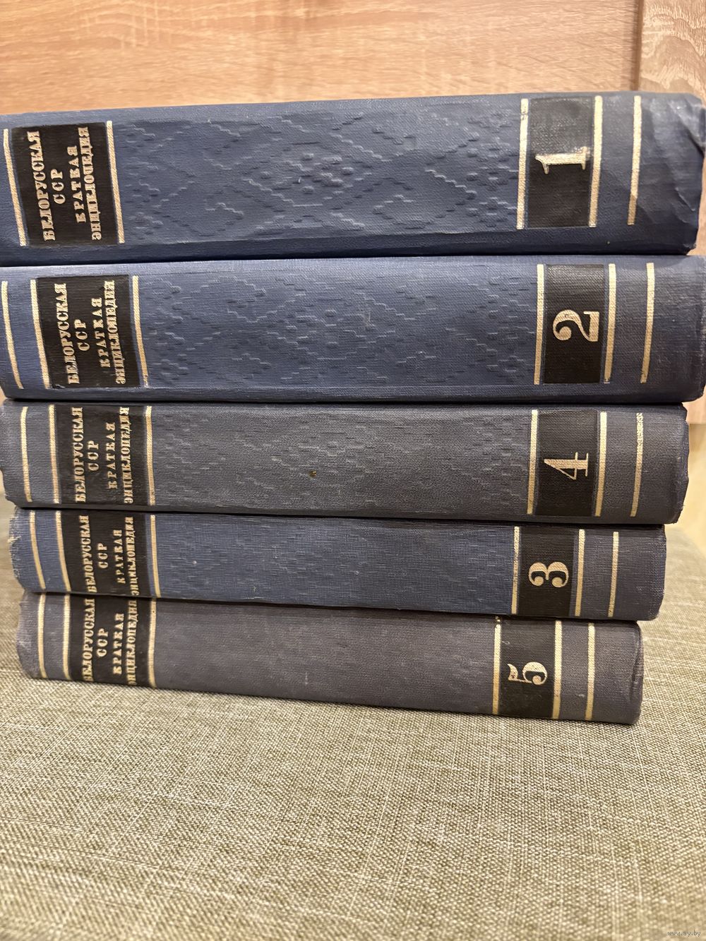 Краткая энциклопедия «Белорусская ССР» в 5ти томах.Годы издания 1979-1981.Покупались как списанная литература,поэтому есть штам «Разрешено к продаже».Внутреннее состояние отличное,внешнее - на фото