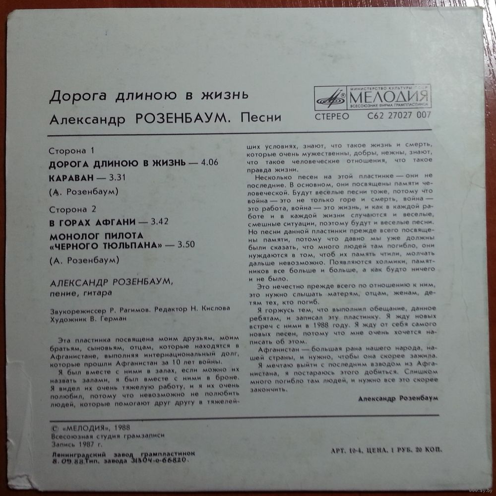 Эта пластинка посвящена моим друзьям, моим братьям, сыновьям, отцам, которые находятся в Афганистане, выполняя интернациональный долг, которые прошли Афганистан за 10 лет войны.