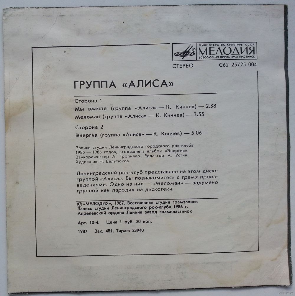Первое официальное издание группы Алиса. Данный миньон, равно как и следующий, предварял появление диска-гиганта "Энергия" - в то время такой была стандартная практика фирмы Мелодия