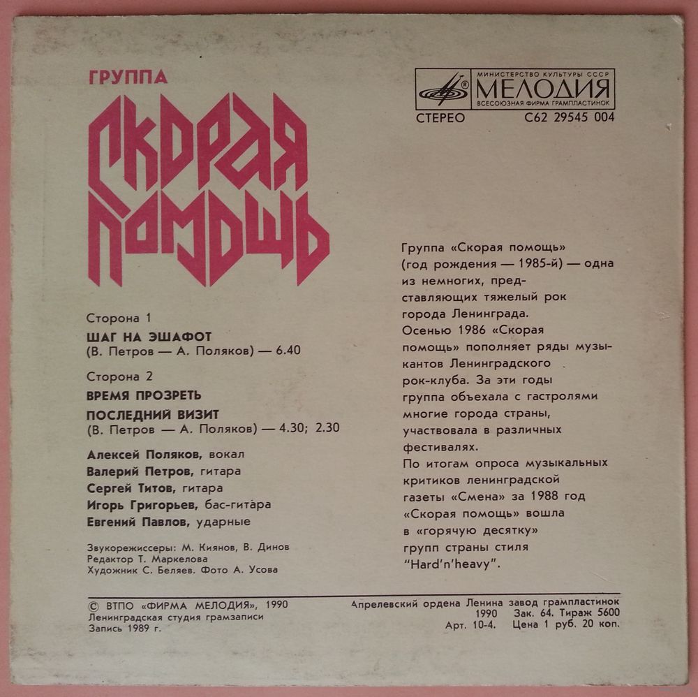 Группе «Скорая помощь» (год рождения — 1985-й) — одна из немногих, представляющих тяжелый рок города Ленинграда. Осенью 1986 «Скорая помощь» пополняет ряды музыкантов Ленинградского рок-клуба. За эти годы группа объехала с гастролями многие города страны, участвовала в различных фестивалях.