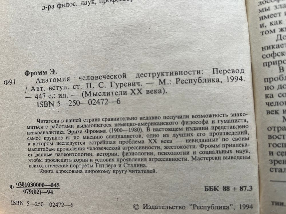 В настоящем издании представлено одно из лучших произведений выдающегося немецко-американского философа и гуманиста, психоаналитика Эриха Фромма (1900-1980), в котором исследуется острейшая проблема XX века — невиданные по своим масштабам проявления человеческой агрессивности, жестокости. Фромм привлекает данные палеонтологии, истории, физиологии, психологии и социальных наук, чтобы проследить корни и условия проявления агрессивности. Мастерски выведены психологические портреты Гитлера и Сталина.