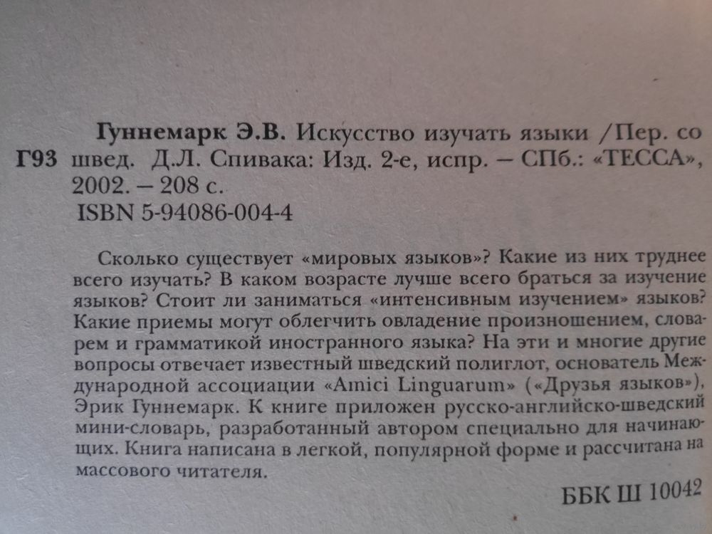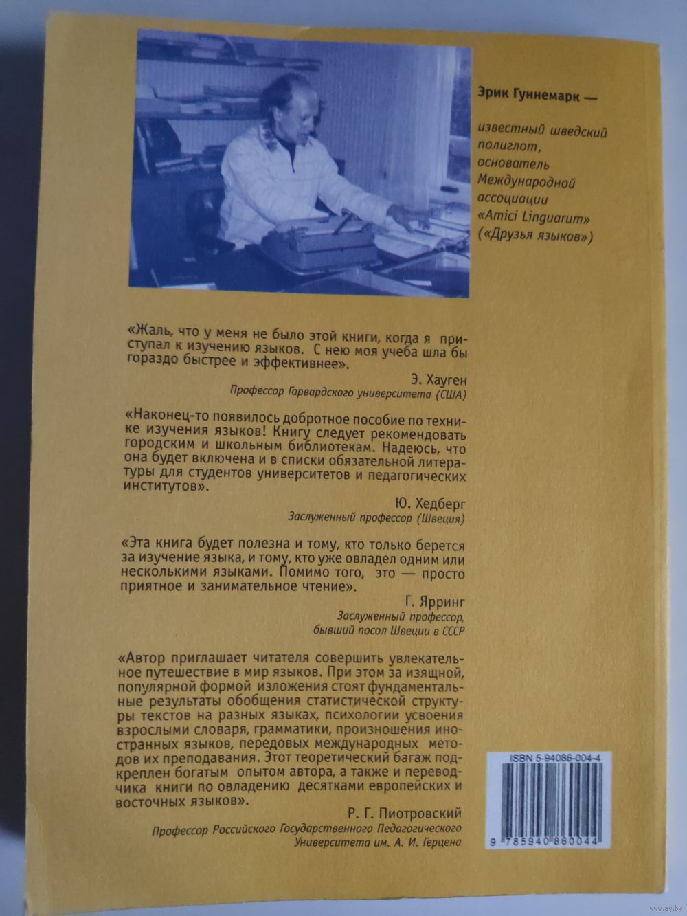 Сколько существует `мировых языков`? Какие из них труднее всего изучать? В каком возрасте лучше всего браться за изучение языков? Стоит ли заниматься `интенсивным изучением` языков? Какие приемы могут облегчить овладение произношением, словарем и грамматикой иностранного языка? На эти и многие другие вопросы отвечает известный шведский полиглот, основатель Международной ассоциации `Amici Linguarum` (`Друзья языков`), Эрик Гуннемарк. К книге приложен русско-английско-шведский мини-словарь, разработанный автором специально для начинающих. Книга написана в легкой, популярной форме и рассчитана на массового читателя.