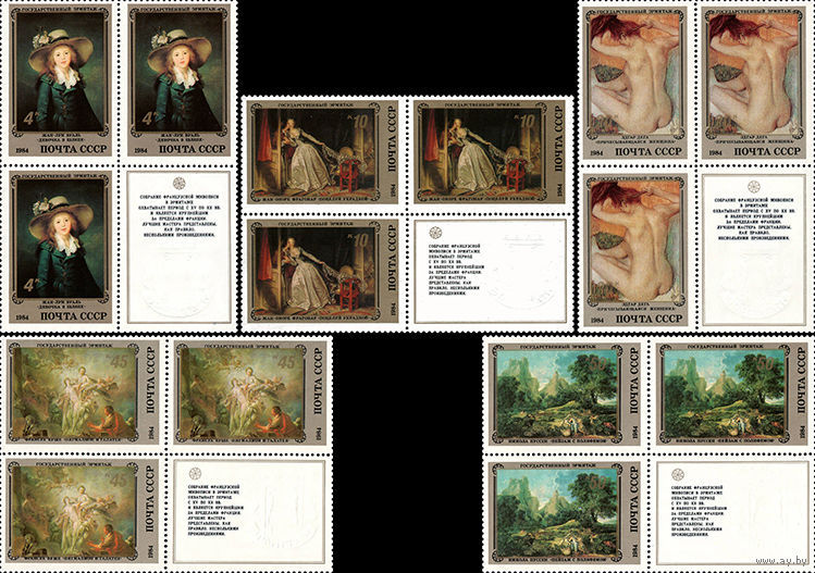 Эрмитаж (Французская живопись) СССР 1984 год (5573-5577) серия из 5 марок в квартблоке с купонами