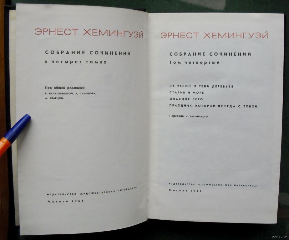 - Эрнест Хемингуэй. Старик и море (повесть, перевод Е. Голышевой, Б. Изакова), стр. 217-230