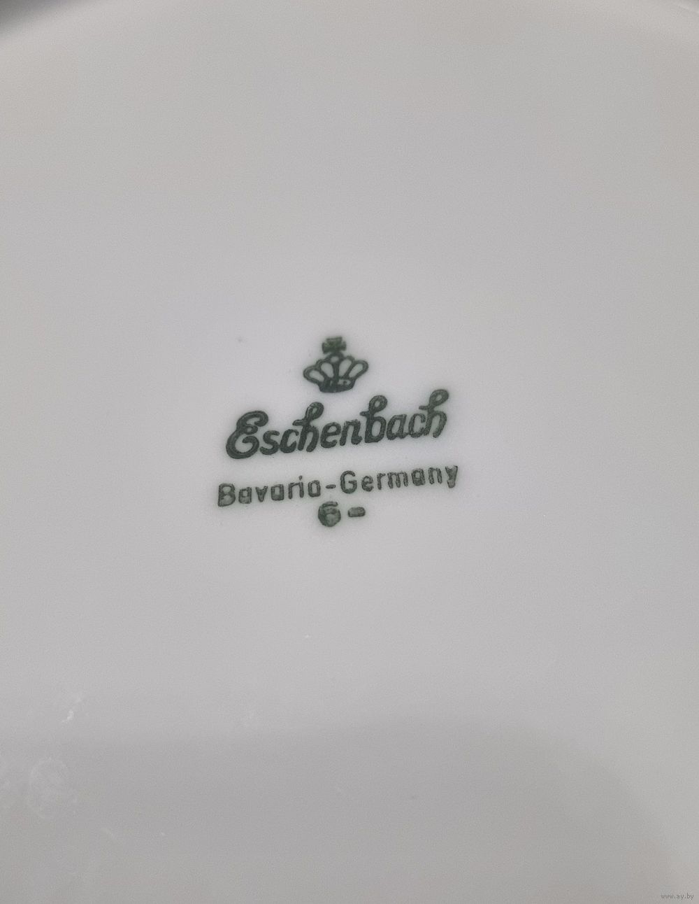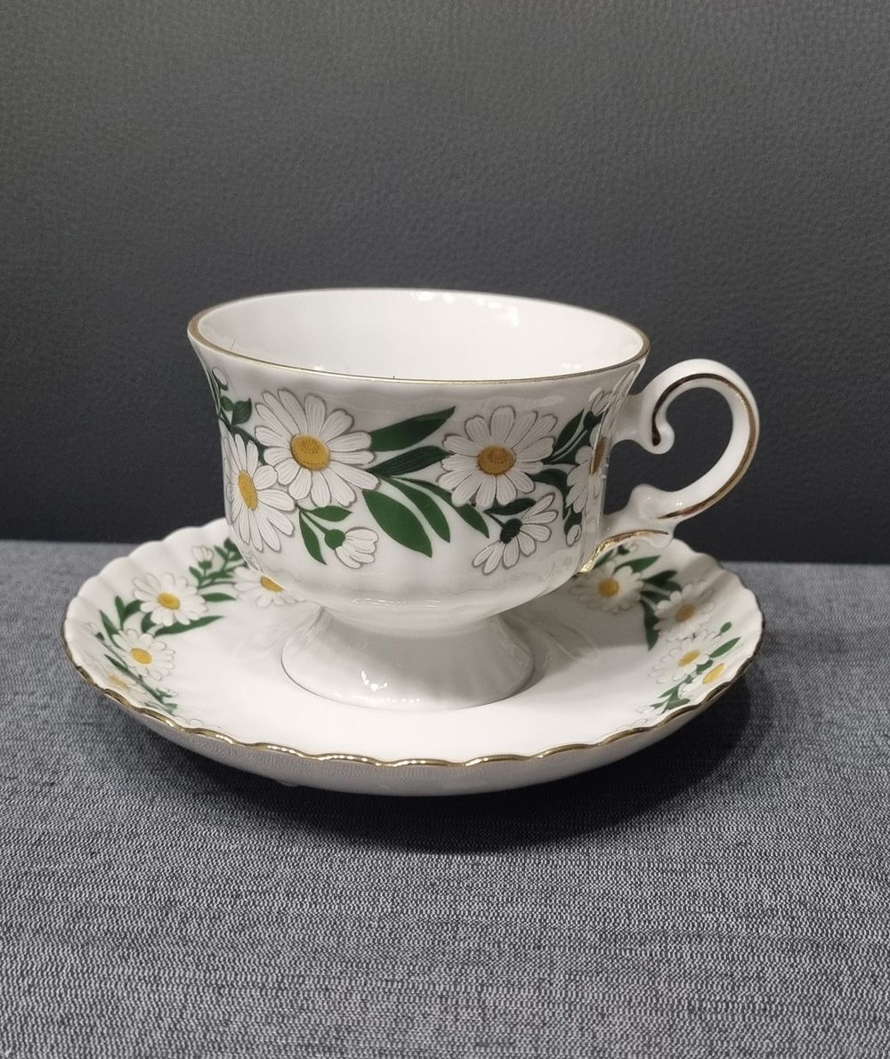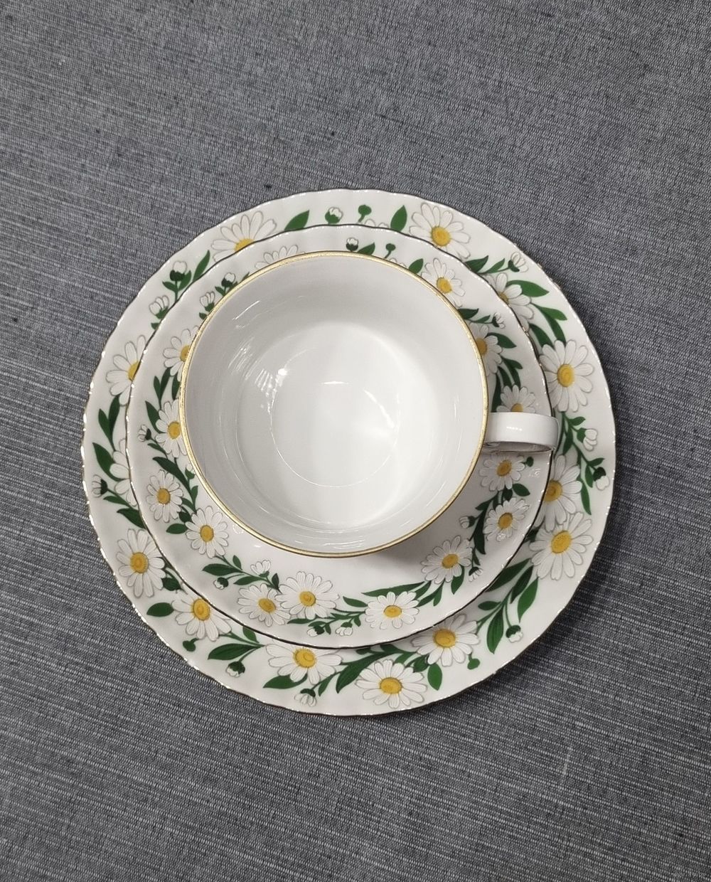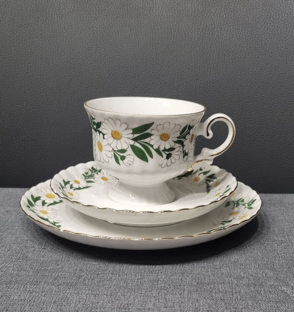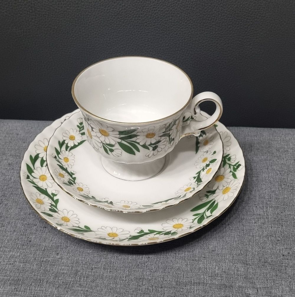 Винтажная фарфоровая чайная пара-трио Eschenbach Bavaria с цветочным узором, напоминающим маргаритки, и золотой каймой.