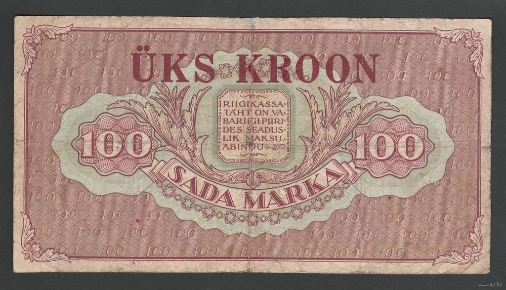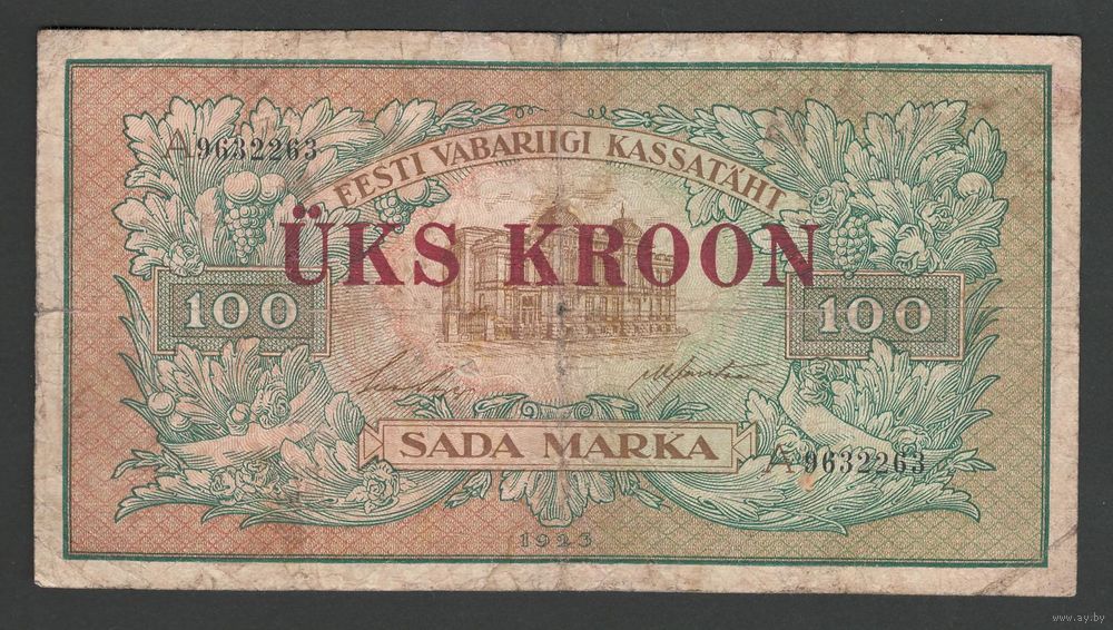 Эстония 1 крона 1928 года (надпечатка на 100 марок 1923 года). Тип Р-61b. Состояние VF-