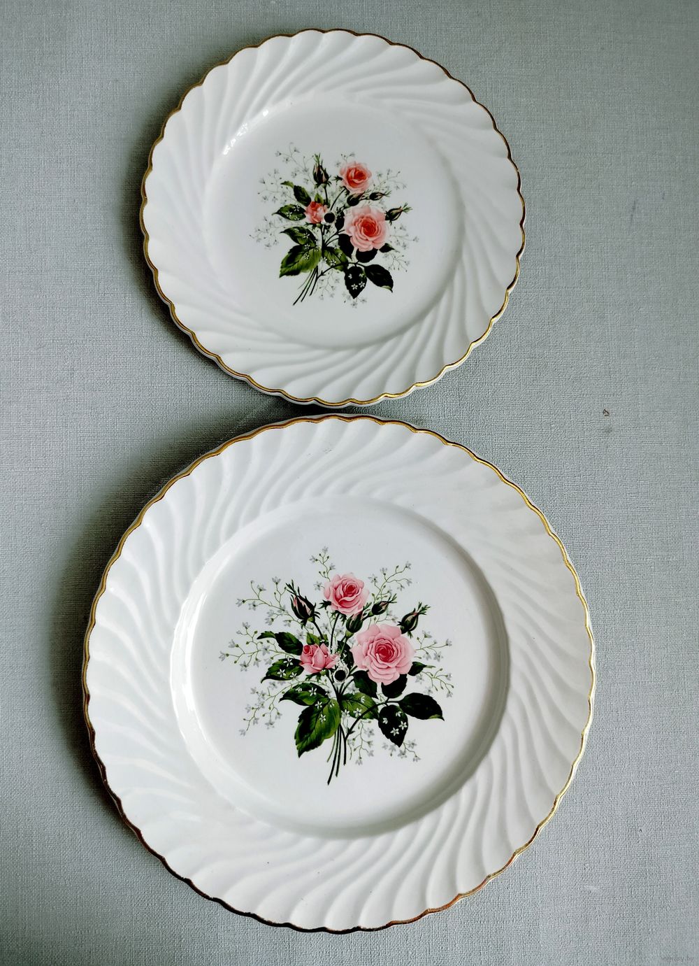Белоснежный фон с утонченным рисунком роз, волнистые края тарелок и золотая кайма по ободку - воплощение элегантности.