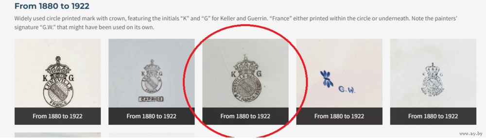 Согласно справочнику "Lunéville Pottery Marks" клеймо на тарелках датировано 1880-1922 гг. Для своего "возраста" они в прекрасном состоянии. Диаметр тарелок 19 см и 24 см.