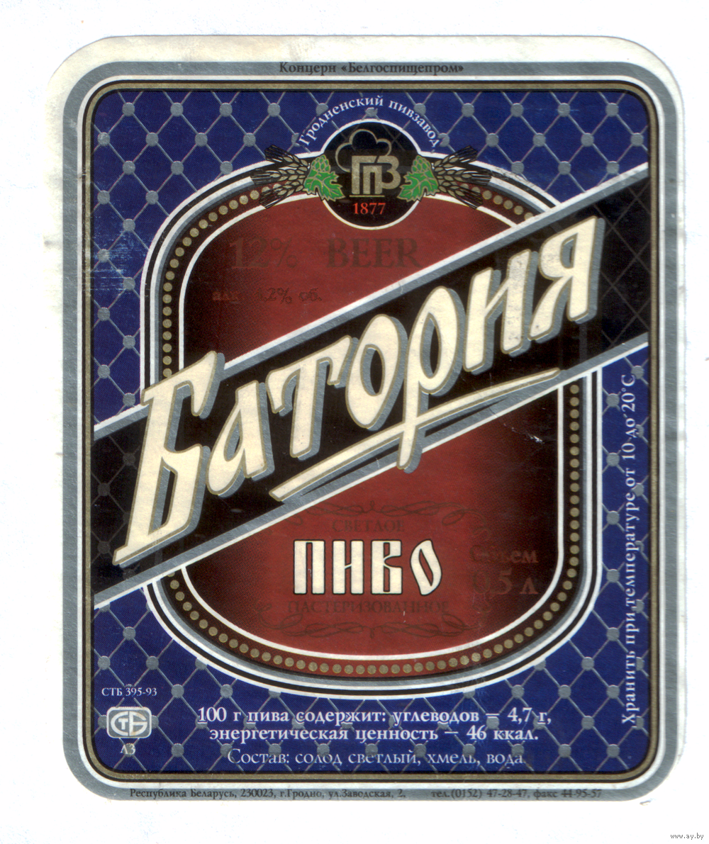 Этикетка пива Батория Гродненский ПЗ б/у М590