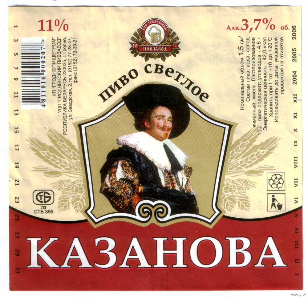 Этикетка пива Казанова Гродненский ПЗ 1,5л б/у М581