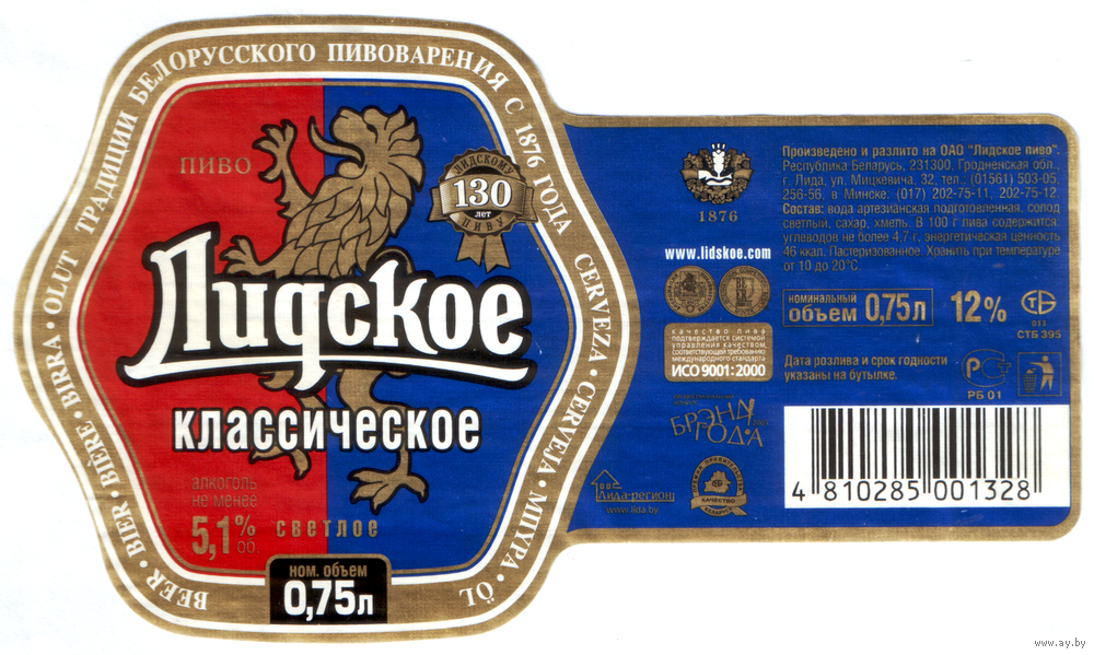 Этикетка пива Классическое 0,75л Лидский ПЗ б/у Т761