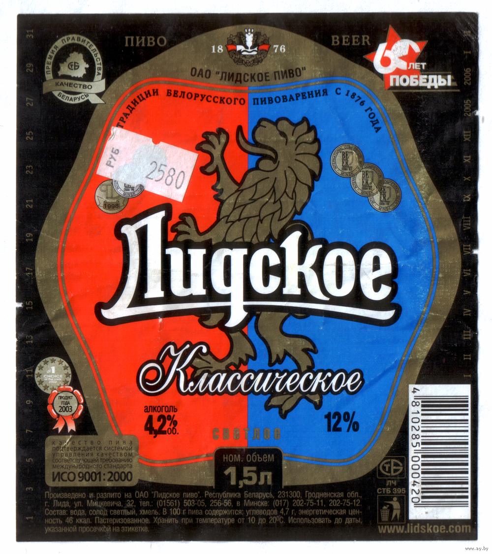 Этикетка пива Классическое 1,5л Лидский ПЗ б/у Т775