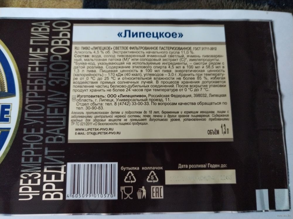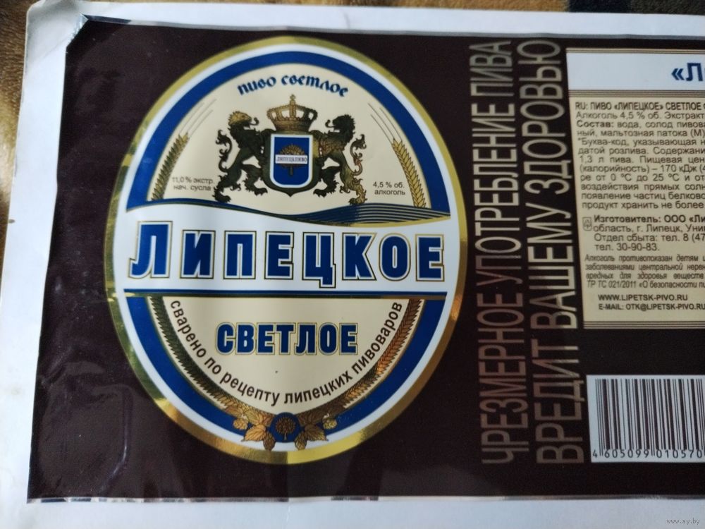 Этикетка пива "ЛИПЕЦКОЕ", пиво светлое. ООО "Липецкпиво". РФ.