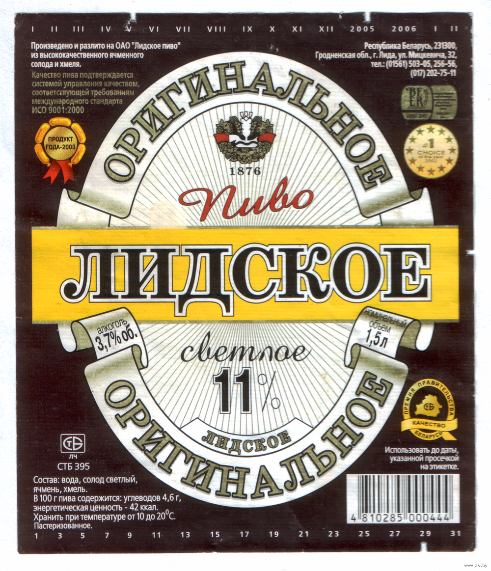 Этикетка пива Оригинальное 1,5л Лидский ПЗ б/у Т786