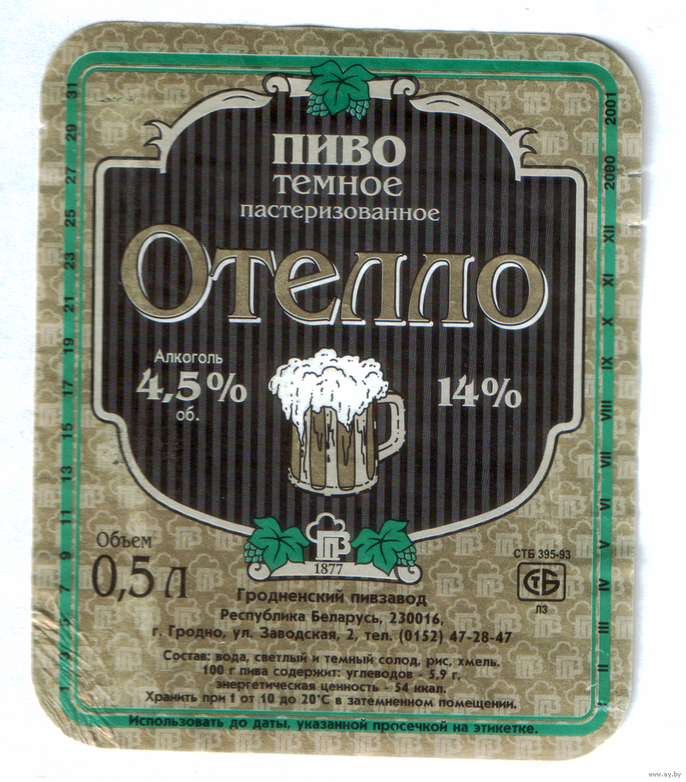Этикетка пива Отелло Гродненский ПЗ б/у М595
