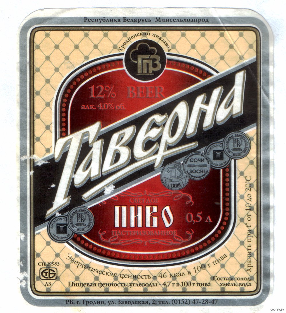 Этикетка пива Таверна Гродненский ПЗ б/у М612