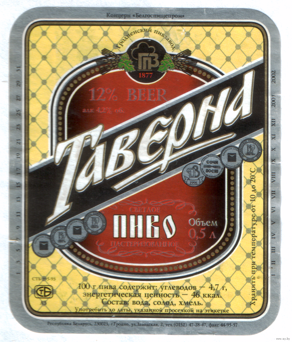 Этикетка пива Таверна Гродненский ПЗ б/у М706