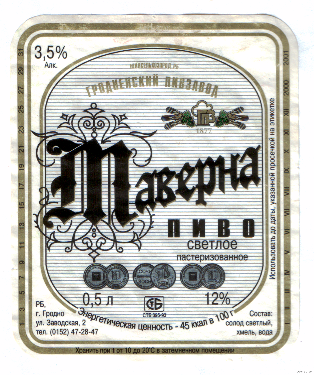 Этикетка пива Таверна Гродненский ПЗ б/у М723