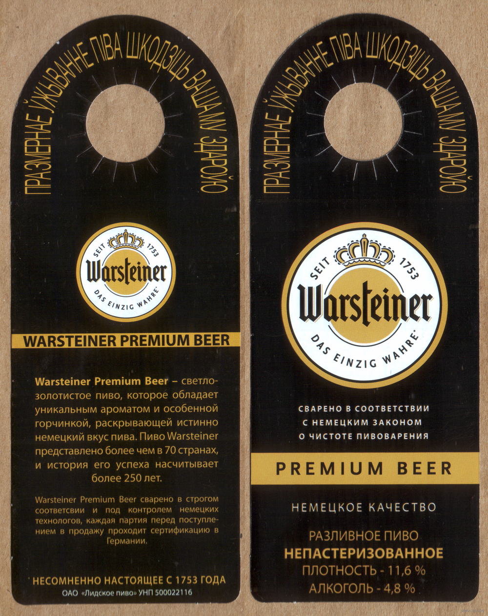 Этикетка разливного пива Warsteiner Лидский ПЗ