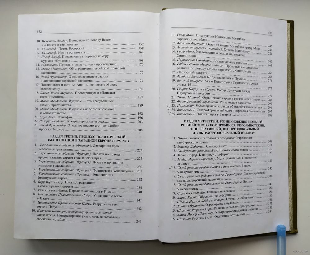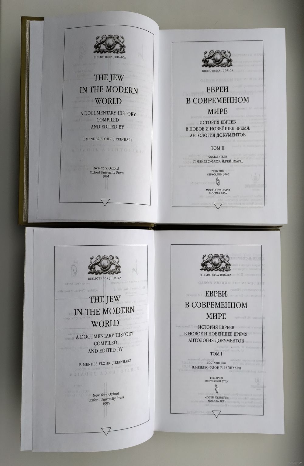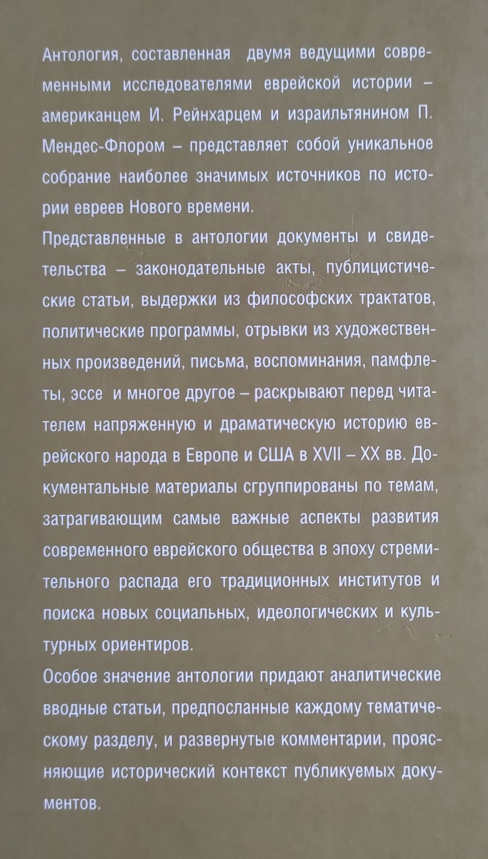 Антология, составленная видными современными исследователями еврейской истории, - американцем И. Рейнхарцем и израильтянином П. Мендес-Флором. Это уникальное собрание наиболее значимых источников по истории евреев Нового времени. В нём представлены законодательные акты, публицистические статьи, выдержки из философских трактатов, политические программы, отрывки из художественных произведений, письма, воспоминания, памфлеты, эссе и др., отражающие драматическую историю еврейского народа в Европе и США в XVII-XX вв.