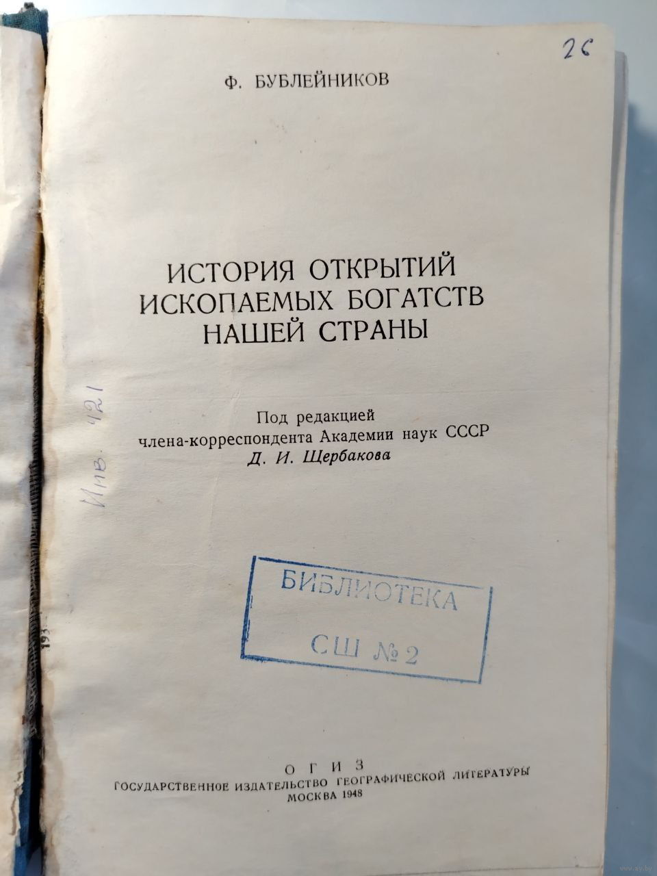 Потрепана обложка. Настоящие, ржавые скобы. Печать библиотеки.