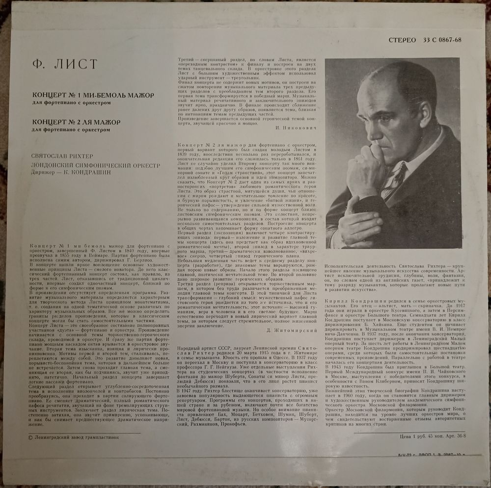 Ф. Лист - Святослав Рихтер, Лондонский симфонический оркестр, К. Кондрашин – Концерт N1 для ф-но с оркестром / Концерт N2 для ф-но с оркестром.