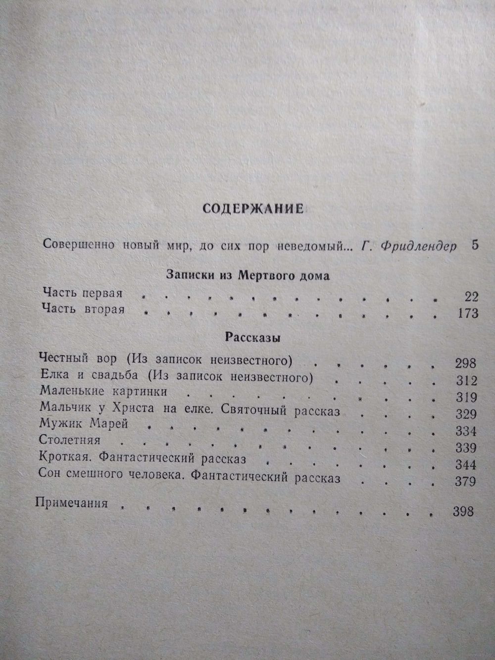 В `Записках из Мертвого дома` отражены впечатления увиденного писателем на каторге в Сибири и в Омском остроге. В книгу входит еще несколько рассказов: Честный вор (Из записок неизвестного). Елка и свадьба (Из записок неизвестного). Маленькие картинки. Мальчик у Христа на елке (Святочный рассказ). Мужик Марей. Столетняя. Кроткая (Фантастический рассказ). Сон смешного человека (Фантастический рассказ).