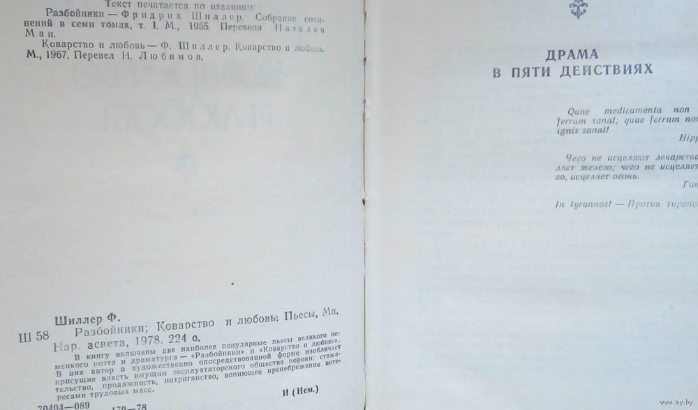 Фридриха Шиллера современники называли поэтом свободы и пламенным защитником человеческой личности. Философ, теоретик искусства, драматург, автор знаменитой "Оды к радости", положенной на музыку Бетховеном, друг великого Гёте, он был вдохновенным выразителем идеалов эпохи Просвещения. В эту книгу вошли самые известные пьесы Шиллера - "Разбойники", за которых в годы Французской революции Шиллер был удостоен почетного звания гражданина Французской республики, а также "Коварство и любовь" - история о трагической судьбе молодых людей, аристократа и простой девушки, чье счастье разрушили низкие интриги. Эти сочинения считаются вершиной немецкой драматургии и не сходят со сцен всего мира вот уже более двух столетий. Из спектаклей последних лет наибольшей популярностью пользуются "Разбойники", поставленные Василием Бархатовым в московском Театре имени Пушкина, а также "Коварство и любовь" в петербургском театре Европы, где главные роли исполняют Елизавета Боярская и Данила Козловский.